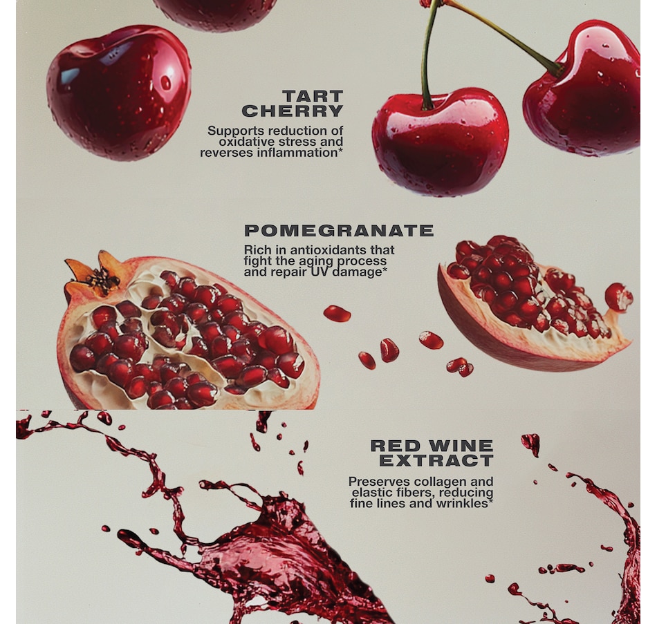 Age like fine wine and retain skin elasticity with these powerful, one-step anti-aging gummies. Made with red wine extract, pomegranate, and tart cherry, our cruelty-free, organic formula supports firmer, smoother skin with potent antioxidants and natural collagen production.