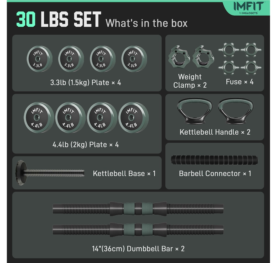 30 lb dumbbells: 4x 3.3lb plates, 4 x 4.4lb plates, 1 x base rod, 2 x Dumbbell bars, 1 x connector, 2 x Kettle handle, 4 x nuts, 2 x clamps