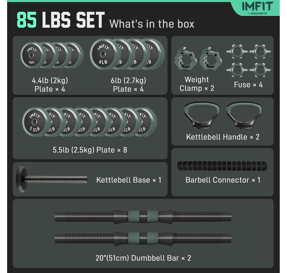 85 lb dumbbells: 4x 4.4lb plates, 8 x 5.5lb plates, 4x 6lb plates, 1 x base rod, 2 x Dumbbell bars, 1 x connector, 2 x Kettle handle, 4 x nuts, 2 x clamps