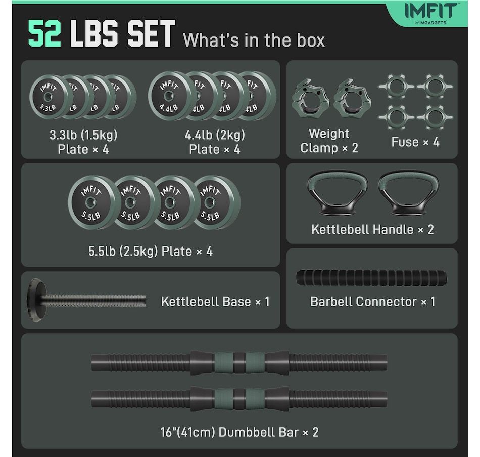 52 lb dumbbells: 4x 3.3lb plates, 4 x 4.4lb plates, 4x 5.5lb plates, 1 x base rod, 2 x Dumbbell bars, 1 x connector, 2 x Kettle handle, 4 x nuts, 2 x clamps