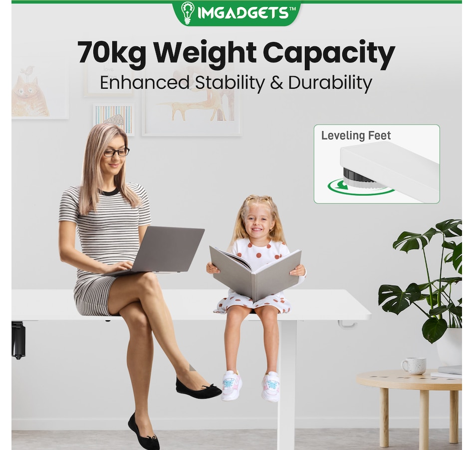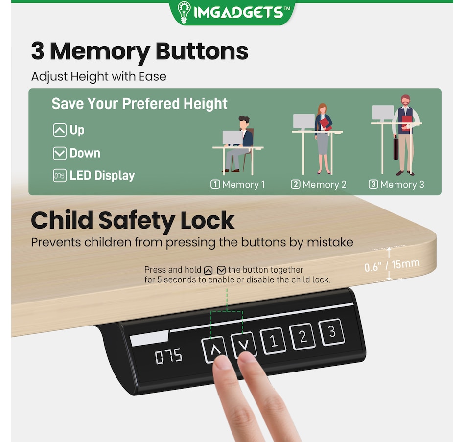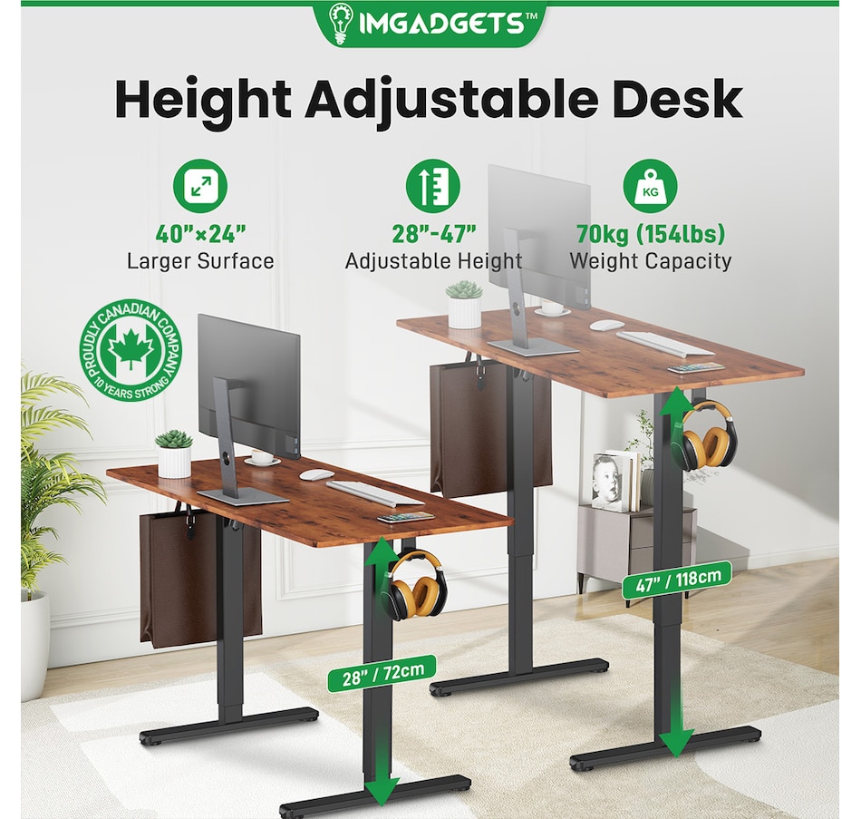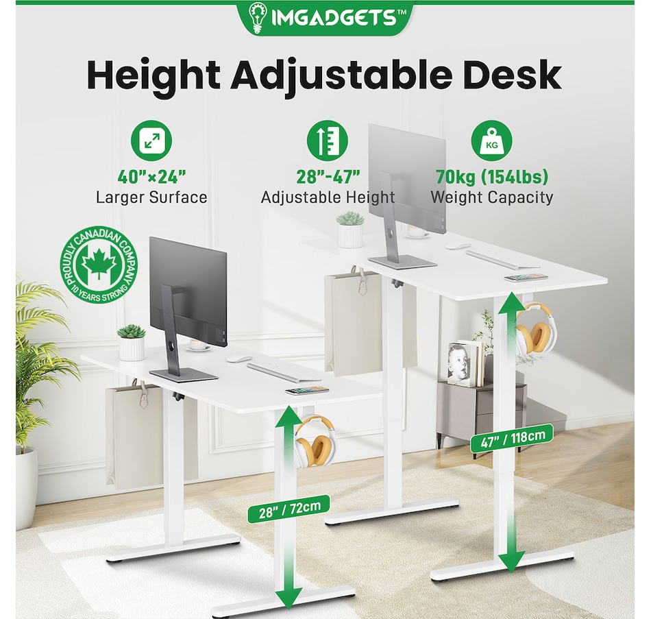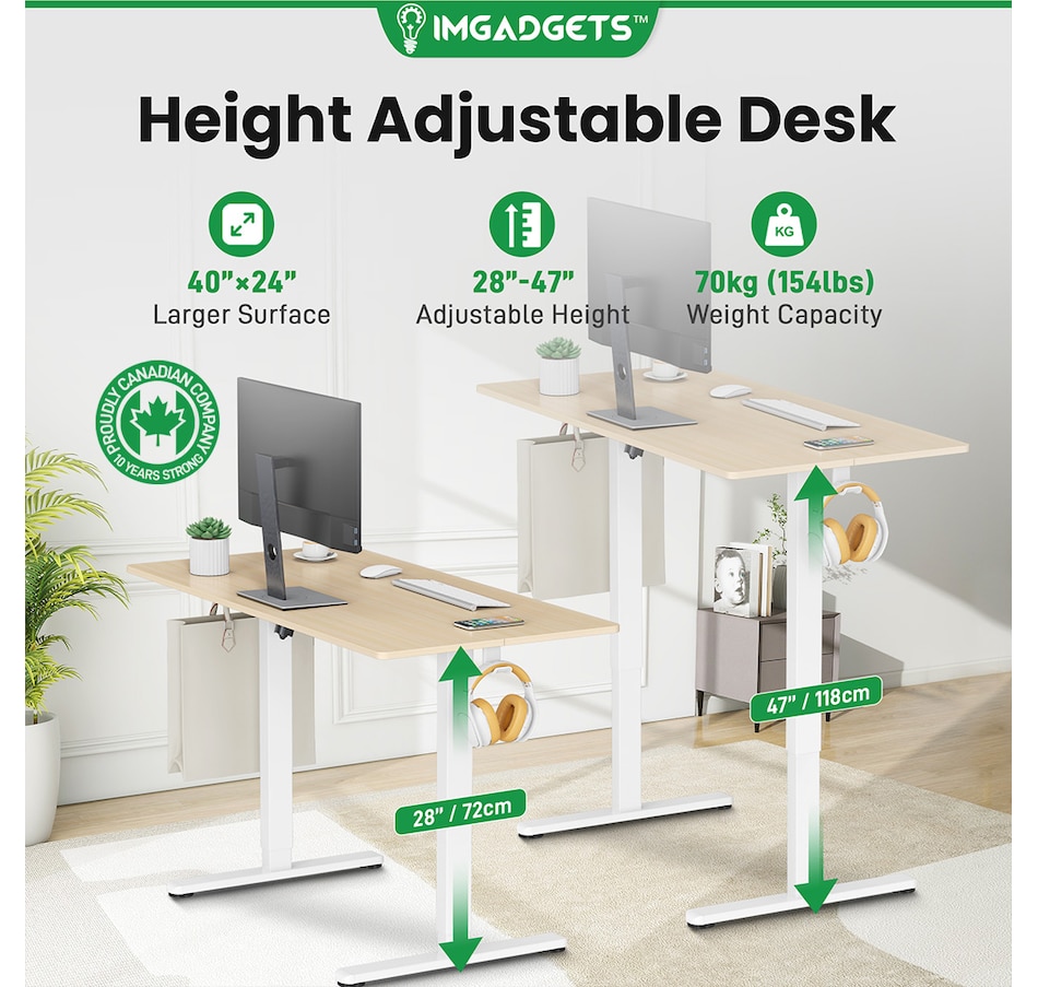 Elevate your workspace with the IMGadgets Electric Standing Desk, a versatile and feature-rich solution for home offices and professional setups. This sit-stand desk offers smooth electric height adjustments from 28" to 47", allowing you to seamlessly switch between sitting and standing. With a built-in 3 memory settings, you can save your favorite height settings for ultimate convenience. The anti-crash design ensures safe height adjustments, preventing damage to objects or the desk itself.