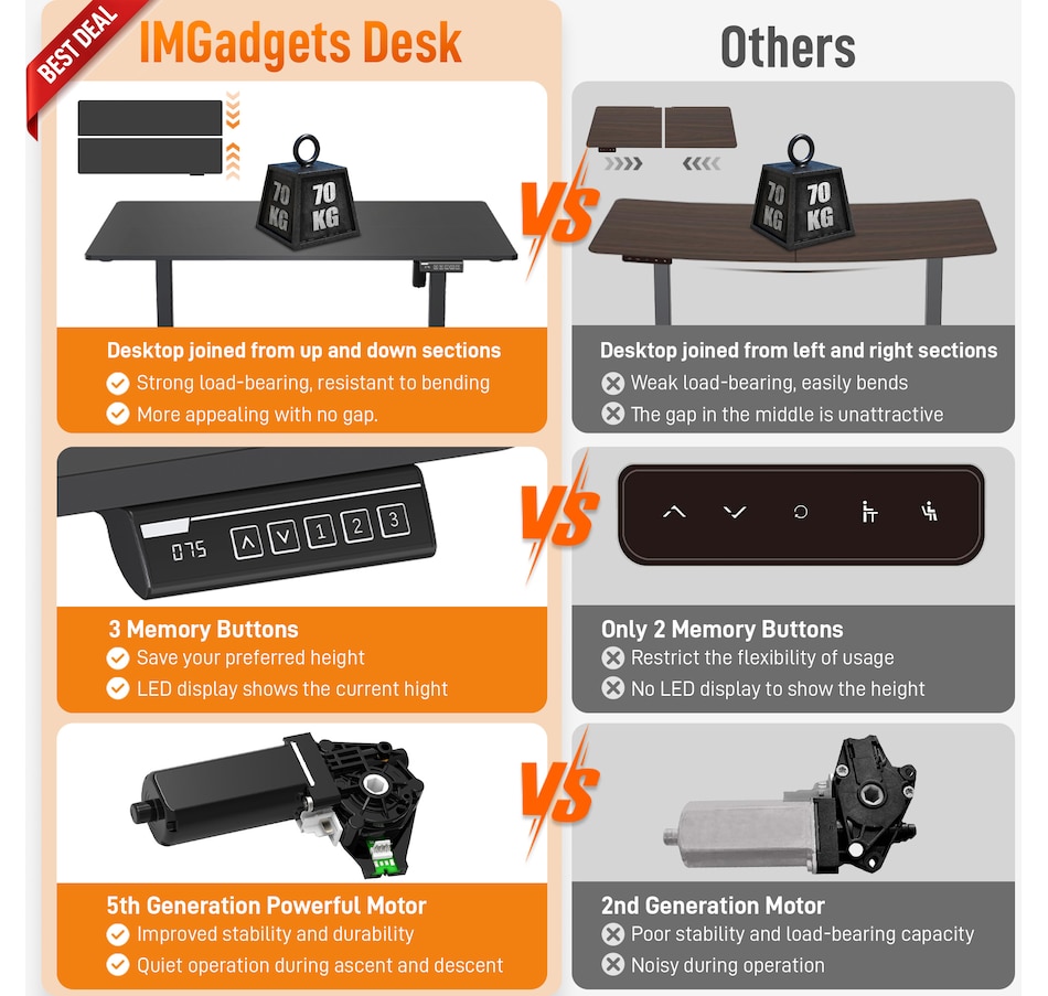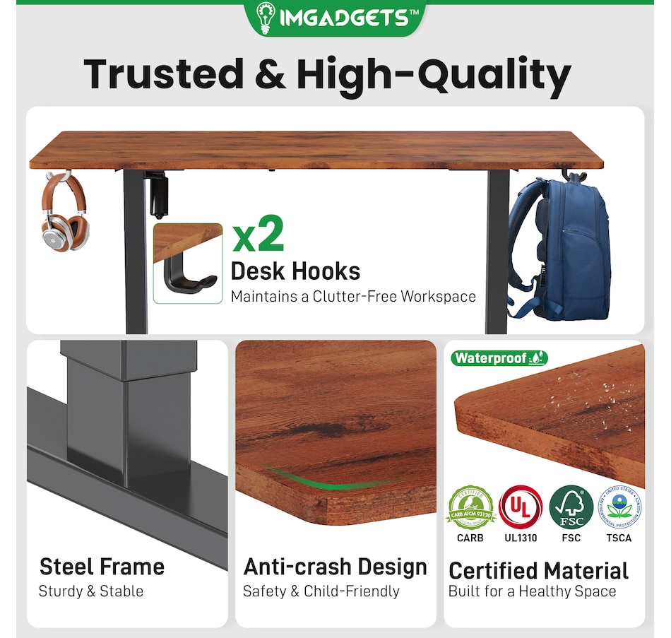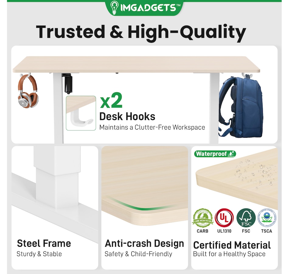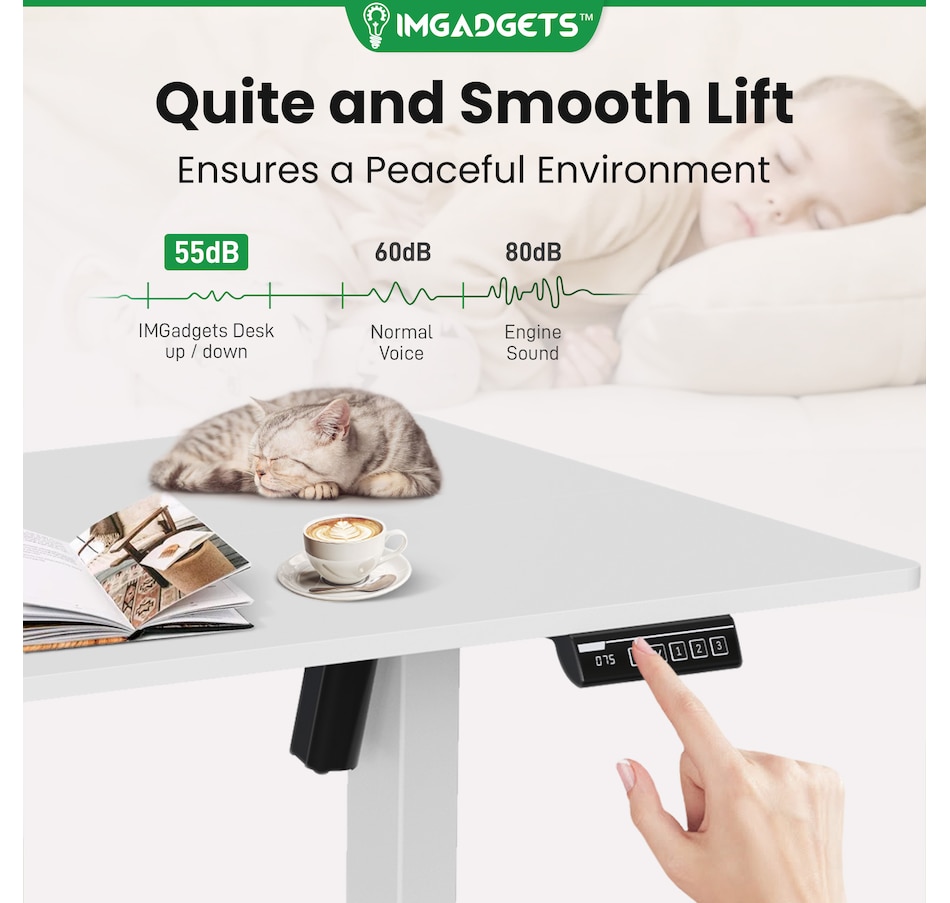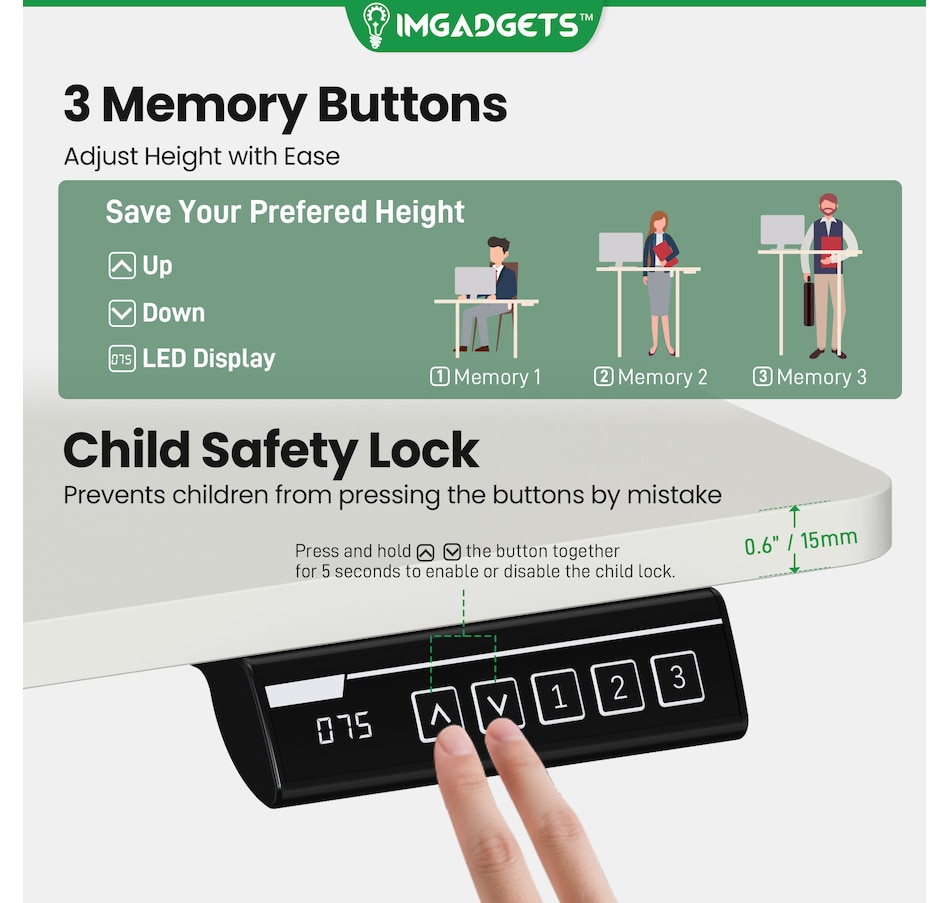 Elevate your workspace with the IMGadgets Electric Standing Desk, a versatile and feature-rich solution for home offices and professional setups. This sit-stand desk offers smooth electric height adjustments from 28" to 47", allowing you to seamlessly switch between sitting and standing. With a built-in 3 memory settings, you can save your favorite height settings for ultimate convenience. The anti-crash design ensures safe height adjustments, preventing damage to objects or the desk itself.