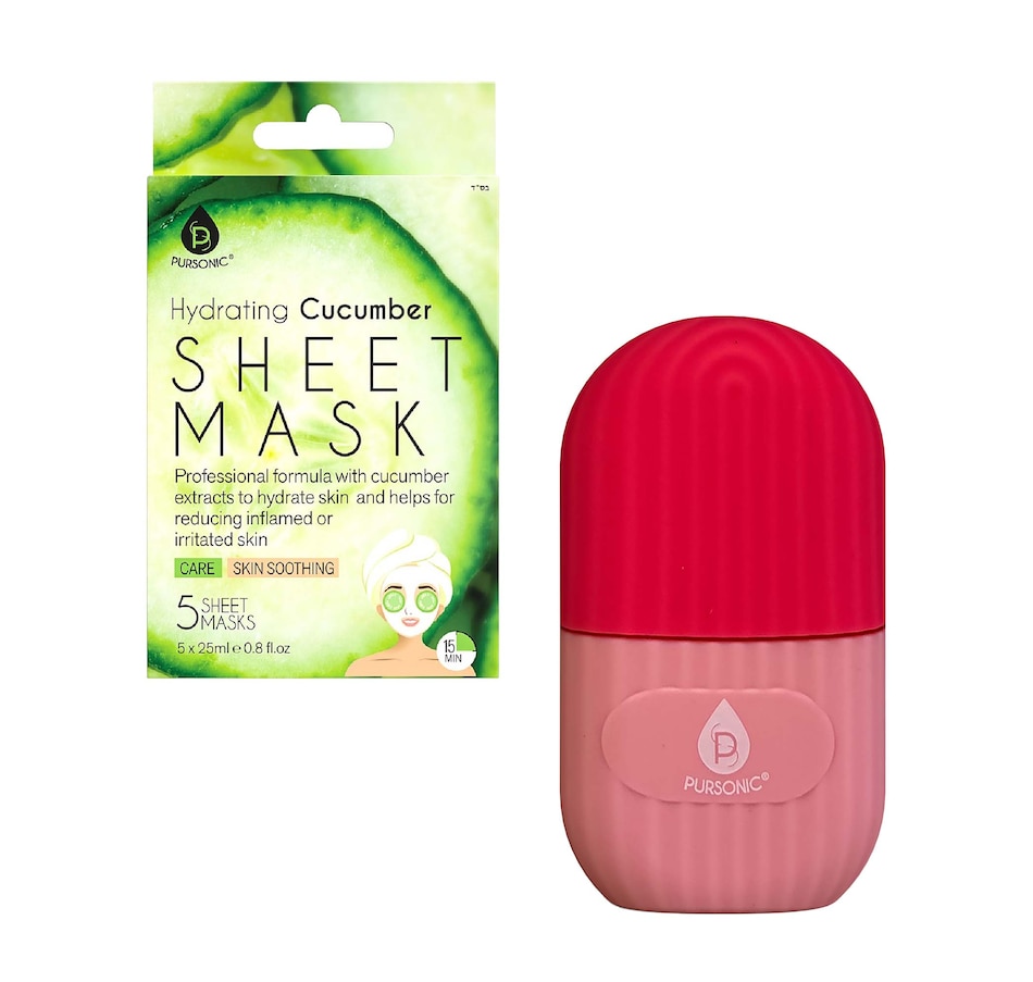 Revitalize and Refresh Your Skin NaturallyTransform your skincare routine with the Ice Cube Facial Roller Massager paired with Pursonic Hydrating Cucumber Sheet Masks. This bundle combines soothing cool therapy with intense hydration for the ultimate spa-like experience at home.What’s Included:Ice Cube Facial Roller Massager:Cooling Therapy: Reduces puffiness, minimizes pores, and refreshes your skin with a revitalizing chill.Gentle Massage: Promotes blood circulation while helping serums and moisturizers absorb more effectively.Multi-Use: Ideal for the face, eyes, and neck to reduce dark circles, alleviate tension, and firm skin.Eco-Friendly: Durable, reusable, and easy to clean for sustainable beauty care.5 Hydrating Cucumber Sheet Masks:Professional Formula: Packed with cucumber extracts for intense hydration.Soothing Benefits: Reduces inflammation and irritation while calming your skin.Anti-Aging Properties: Helps firm sagging areas, leaving your face refreshed and youthful.Why Choose This Bundle?A Complete Skin Reset: Start with the Ice Cube Facial Roller to depuff and refresh, then follow up with a Cucumber Sheet Mask for deep hydration and nourishment.Spa-Quality at Home: Enjoy professional-level treatments in the comfort of your own space.Perfect for All Skin Types: Gentle and effective, this bundle is designed to suit any skincare routine.How to Use:Ice Cube Facial Roller:Fill with water, freeze, and roll gently over your face, neck, and eyes. Use daily for best results.Hydrating Cucumber Sheet Masks:Apply to clean, dry skin. Leave on for 15–20 minutes, then gently pat in remaining serum.Benefits of Regular Use:Decreases puffiness and dark circles under the eyes.Hydrates and soothes skin for a radiant glow.Enhances skin texture and elasticity while reducing signs of aging.Get glowing, refreshed skin every day with this rejuvenating duo! Treat yourself or gift it to someone special who deserves a little self-care.