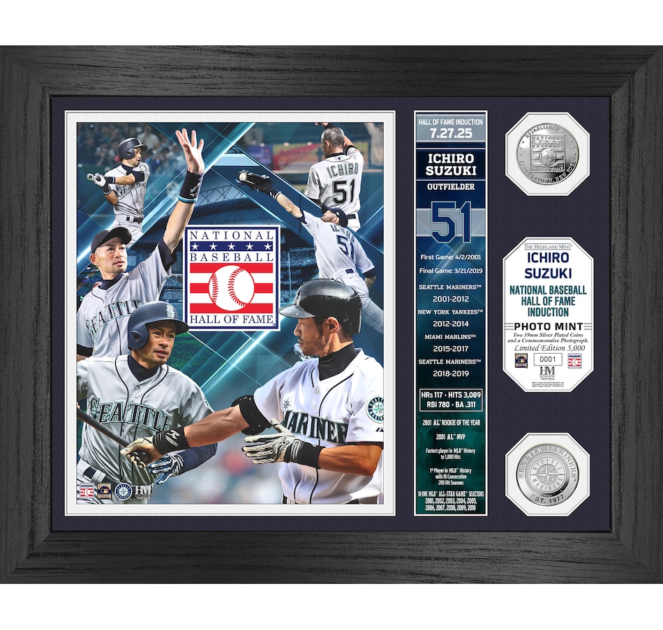 This limited-edition 13" x 16" frame features, in double matting under acrylic glass, an individually numbered 8" x 11" collage print commemorating Ichiro Suzuki's 2025 induction into the National Baseball Hall of Fame. He is the first Japanese-born player to receive this honour. The print features Suzuki in multiple poses and is combined with a 39-mm minted National Baseball Hall of Fame silver-plated coin and a Seattle Mariners silver-plated coin, as well as a banner listing his career accomplishments. This is a limited edition of only 5,000 and is officially licenced by the NBHOF and Suzuki, and each photo mint also has a numbered certificate of authenticity matted between the two silver-plated coins.