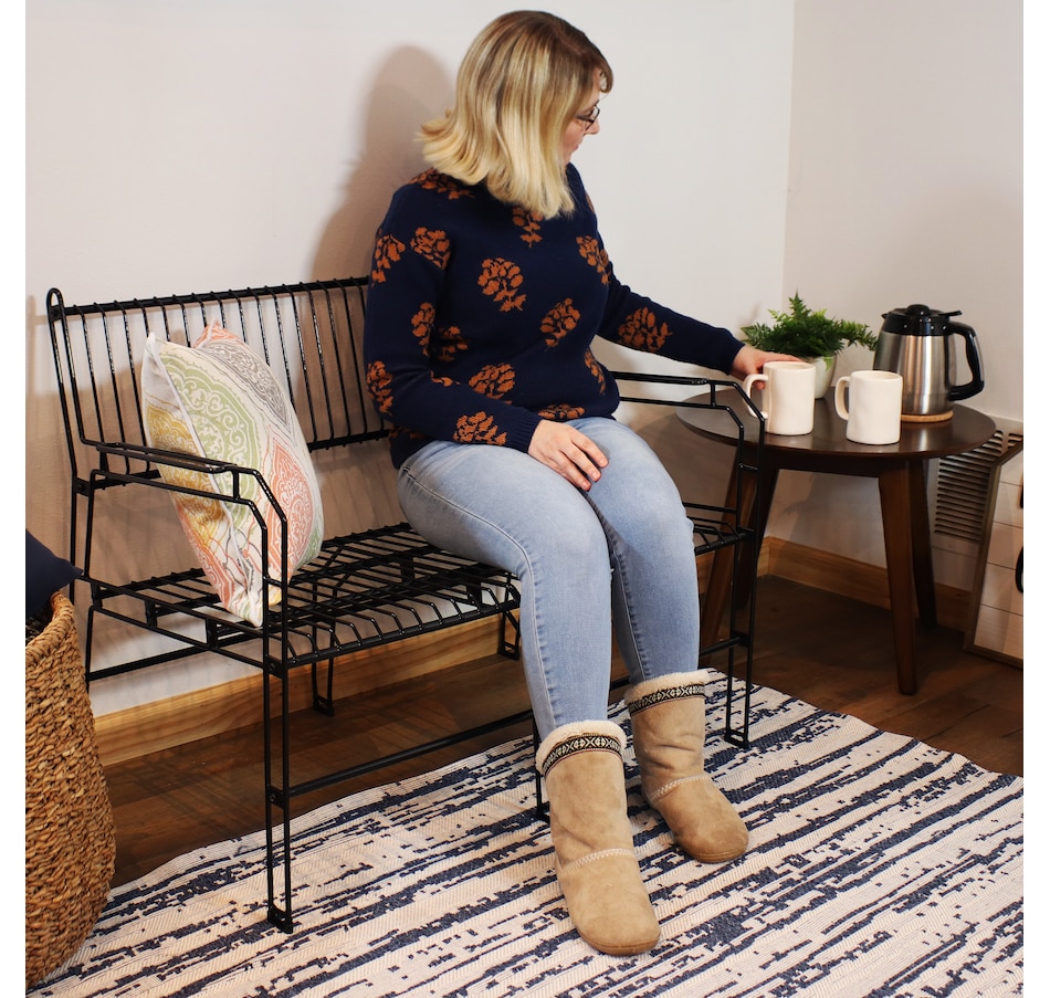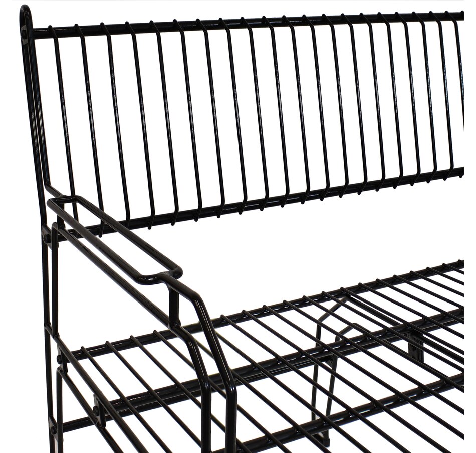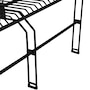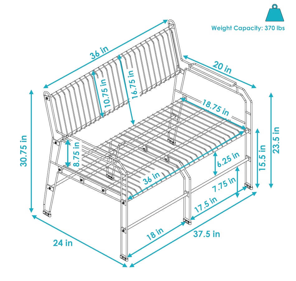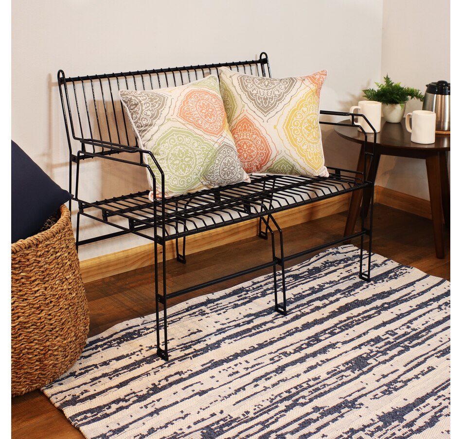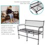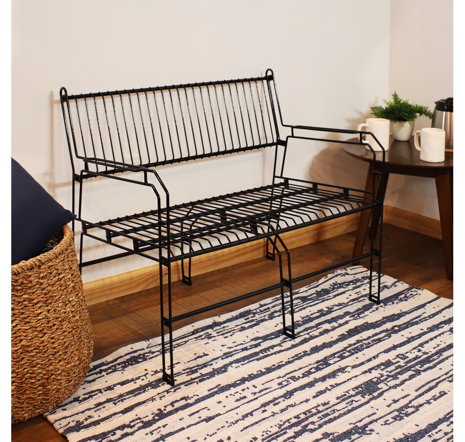 This black metal patio bench blends sleek design with practical function, making it a standout addition to any compact indoor or outdoor space. Measuring 37.5” wide and weighing just over 21 pounds, it offers comfortable seating for two without overpowering smaller patios, balconies, or sunrooms. Despite its light weight, this two seat bench is strong enough to support up to 370 pounds, making it both portable and sturdy. Constructed from thermoplastic steel wire and finished with a clear LDPE coating, the frame resists weathering, rust, and everyday wear while maintaining a modern, open-wire aesthetic. The decorative garden bench stands on six legs, each capped with plastic bottoms to provide added stability across various surfaces. Whether used in a garden nook, entryway, or indoor lounge area, its geometric design and matte black finish contribute a stylish edge. Assembly is simple and efficient with all required hardware included, only a Phillips screwdriver is needed. Maintenance is minimal, requiring just a spot clean with soapy water to keep the surface looking sharp.