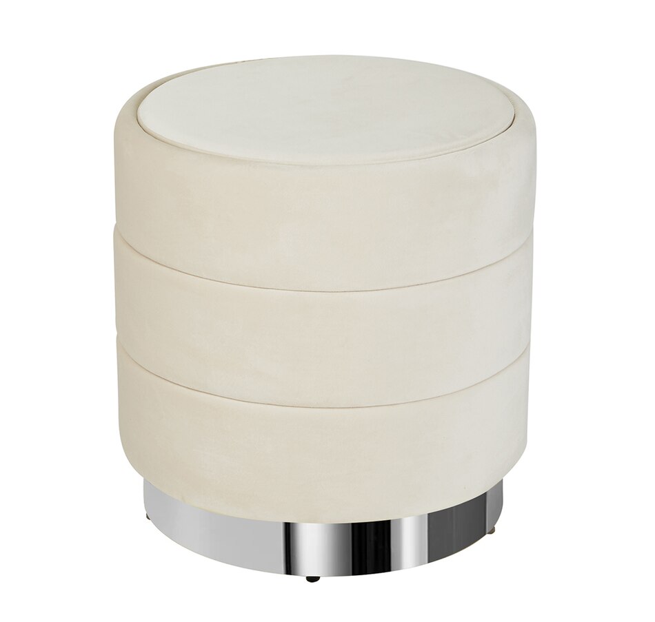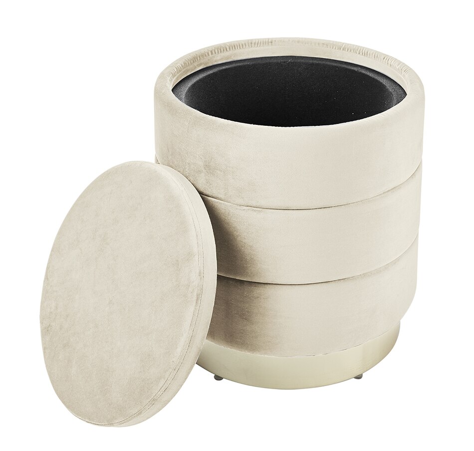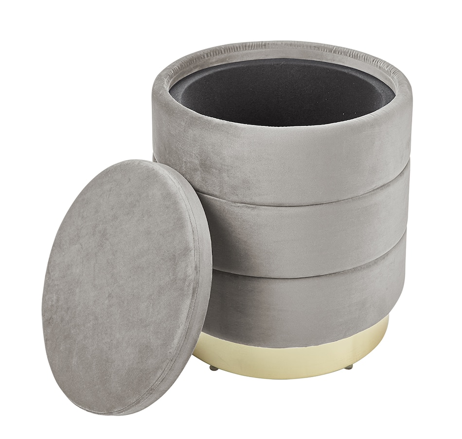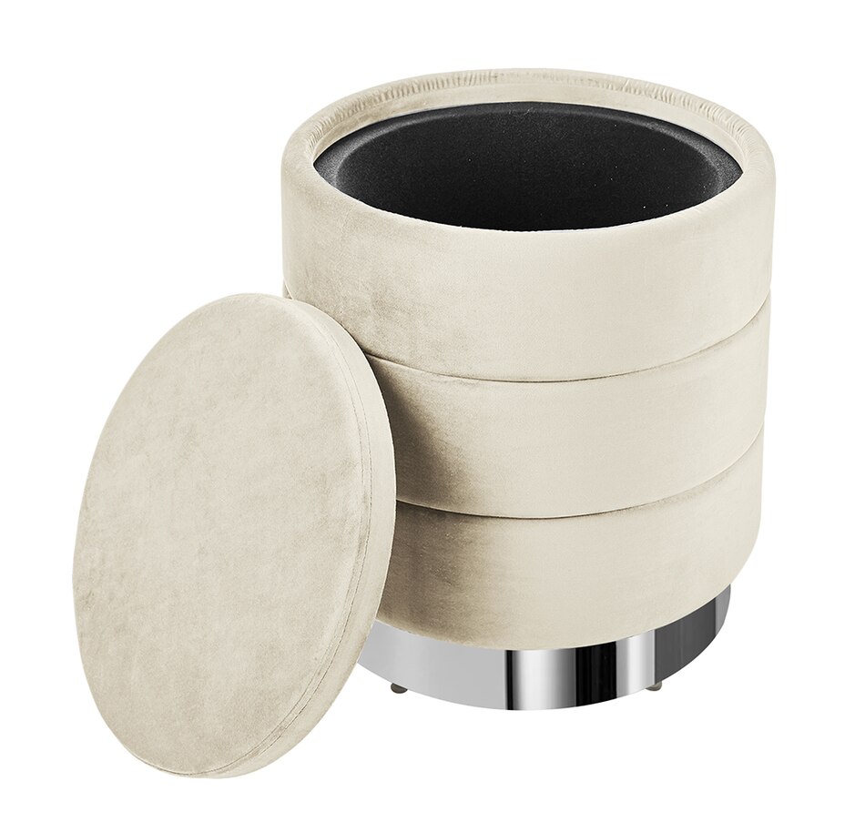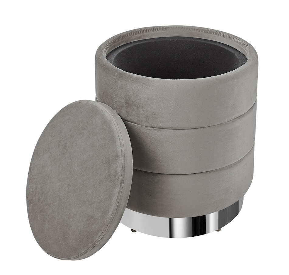 The Inspire Me! home decor Olivia ottoman features velvet upholstery and a beautiful tier panel design. Extremely versatile in its functionality, it provides comfortable seating for your family members and guests, and allows items to be stored neatly inside simultaneously. It provides a good amount of space for hidden storage with its inset lift-off lid, and is great for shoes, small toys, remotes, wires, and so much more. It features a metal base in brushed silver or golden brass, instantly adding a modern and sleek touch to your home. Use it in the entryway to sit down while you slip your shoes on in the morning, place it in your living room for extra seating, or use it in your bedroom as a beautiful accent piece. This ottoman will ship fully assembled, so that you can put it to use right away without worry. It is fantastic for both your own space and also great as a housewarming gift because of its versatility and usefulness.