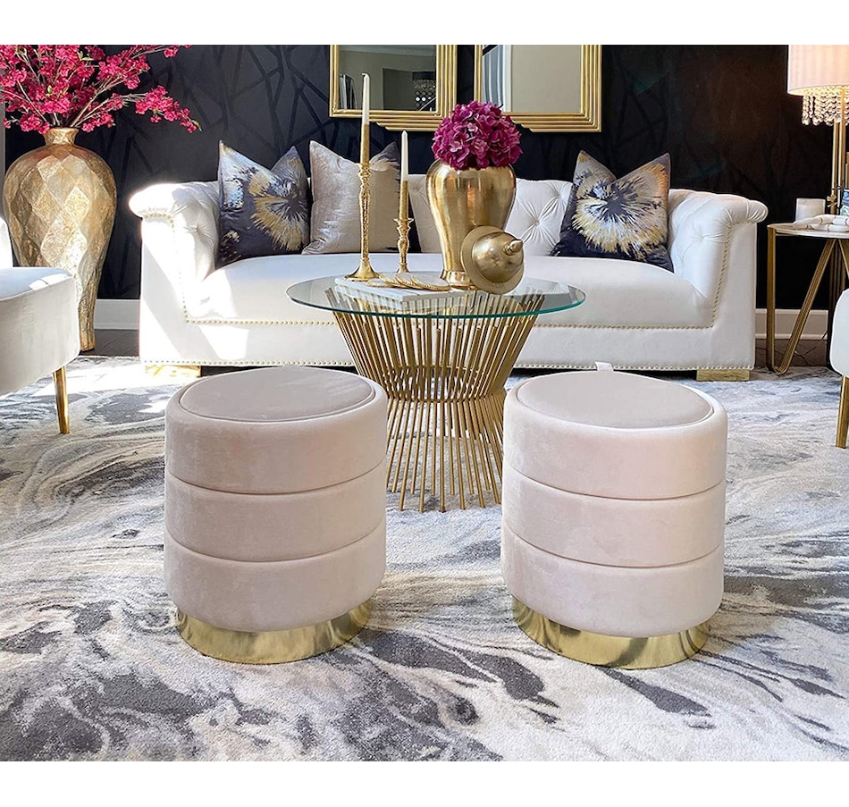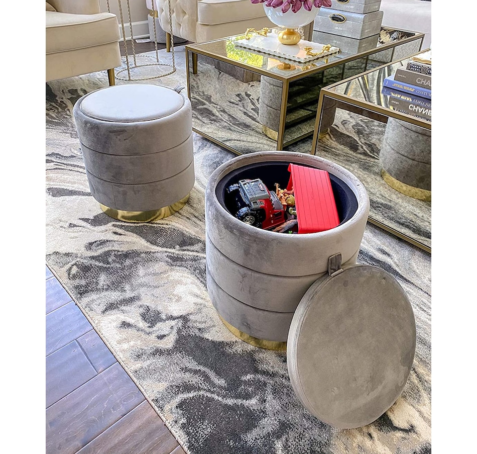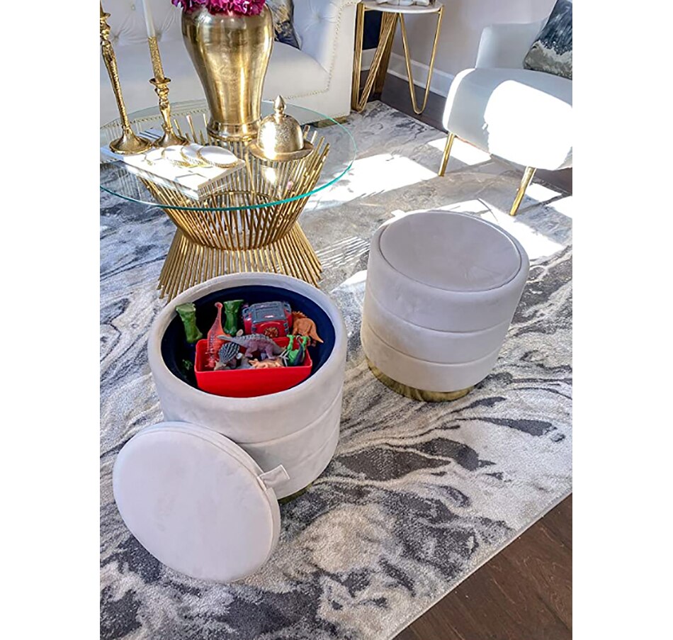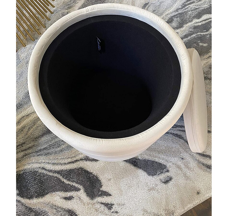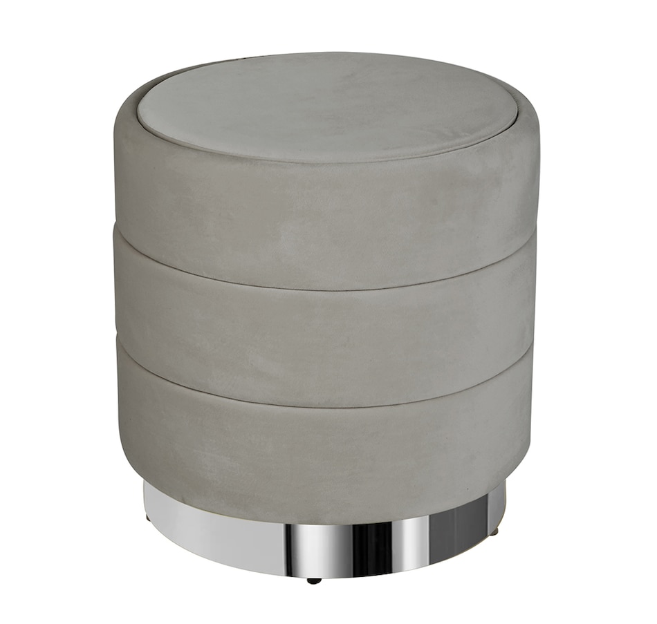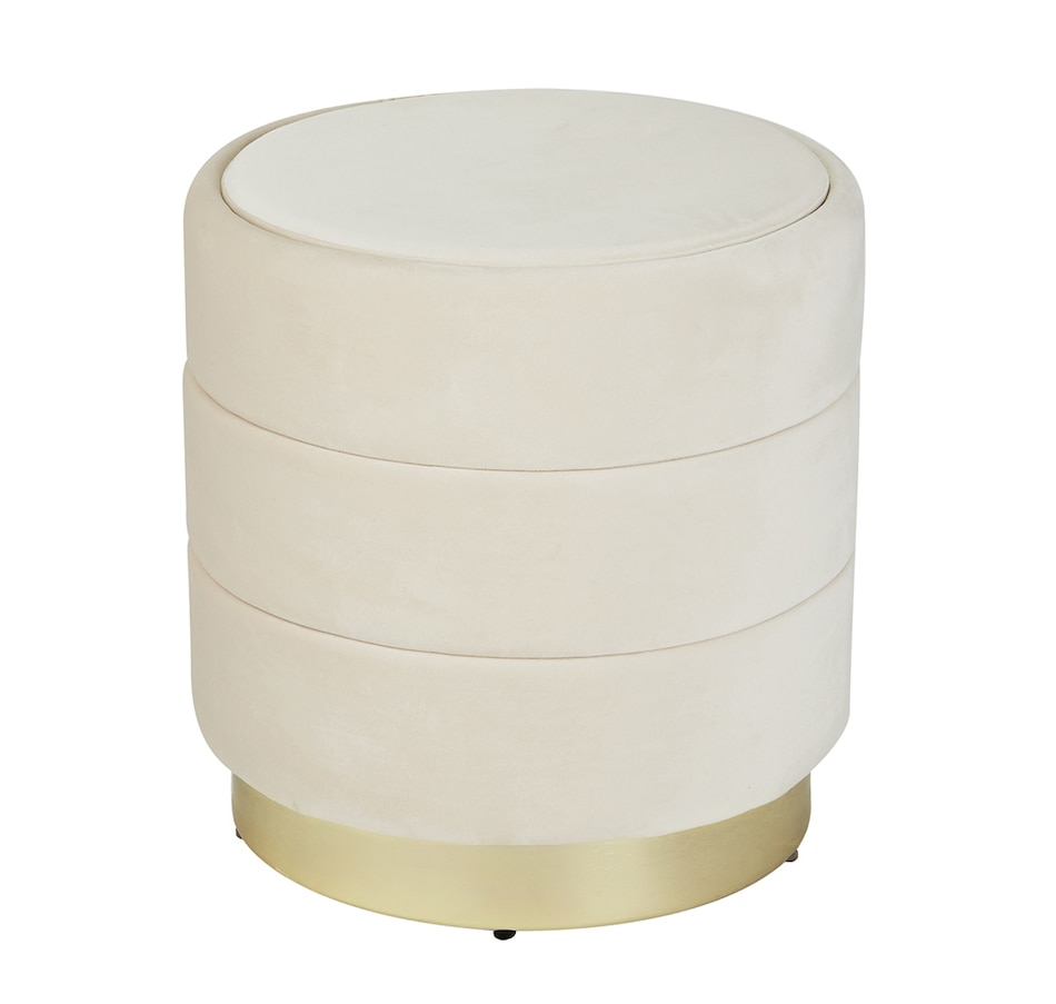 The Inspire Me! home decor Olivia ottoman features velvet upholstery and a beautiful tier panel design. Extremely versatile in its functionality, it provides comfortable seating for your family members and guests, and allows items to be stored neatly inside simultaneously. It provides a good amount of space for hidden storage with its inset lift-off lid, and is great for shoes, small toys, remotes, wires, and so much more. It features a metal base in brushed silver or golden brass, instantly adding a modern and sleek touch to your home. Use it in the entryway to sit down while you slip your shoes on in the morning, place it in your living room for extra seating, or use it in your bedroom as a beautiful accent piece. This ottoman will ship fully assembled, so that you can put it to use right away without worry. It is fantastic for both your own space and also great as a housewarming gift because of its versatility and usefulness.