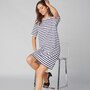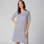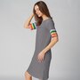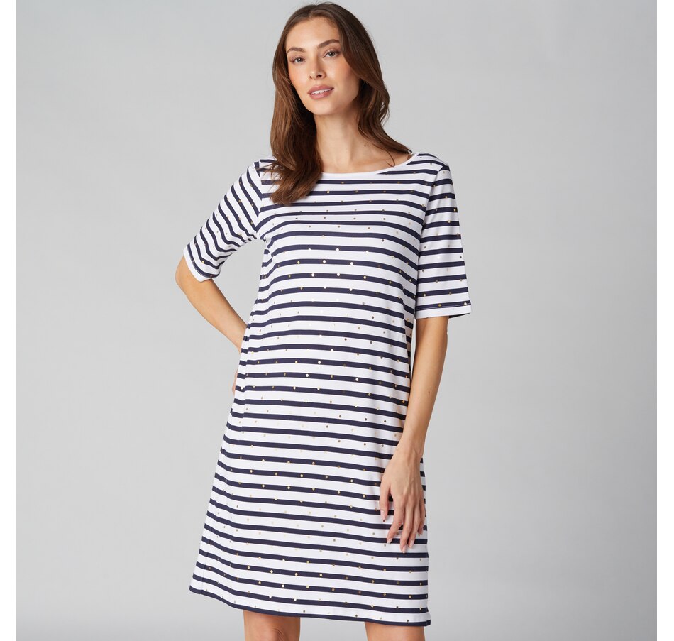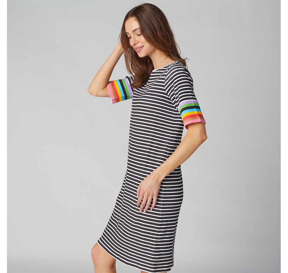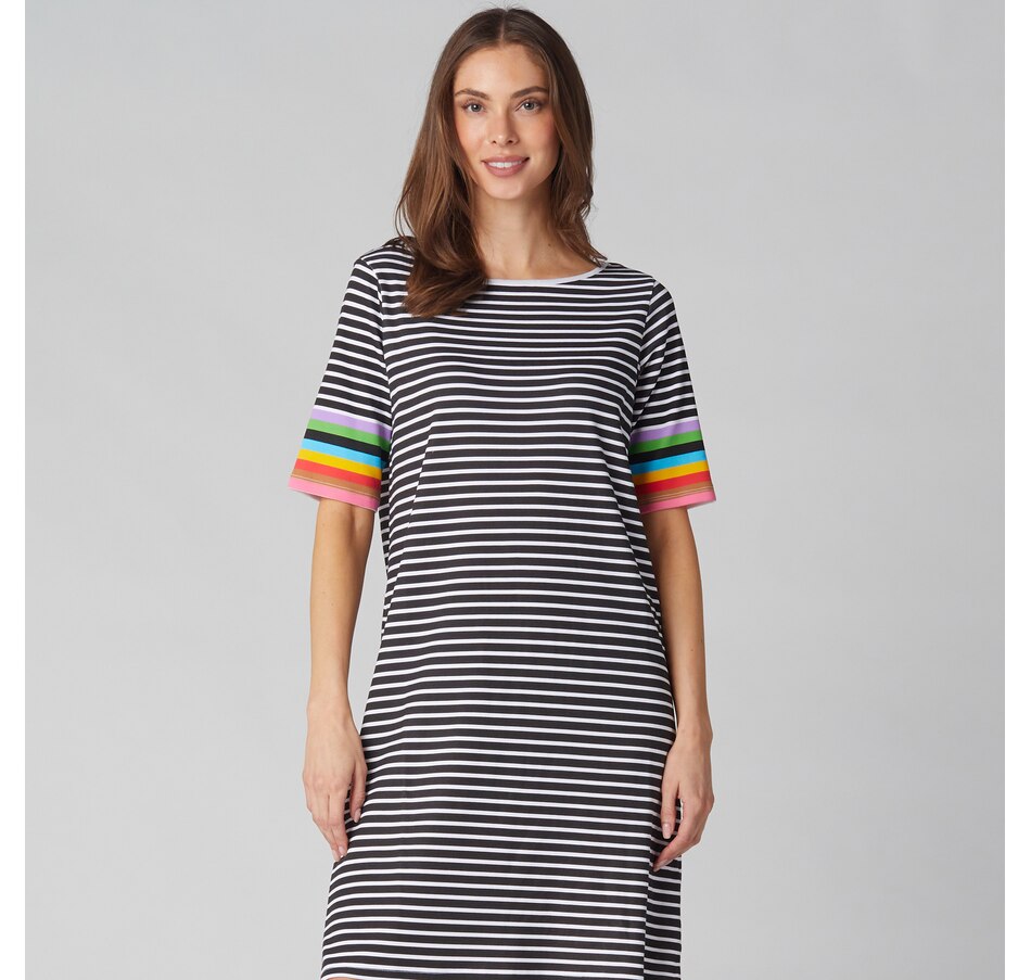 You'll elevate every warm-weather look in undeniable style with this novelty striped 3/4 sleeve t-shirt dress from Isaac Mizrahi!
