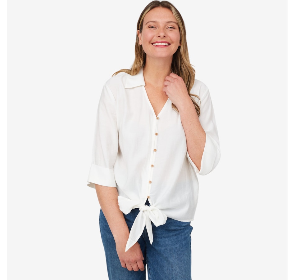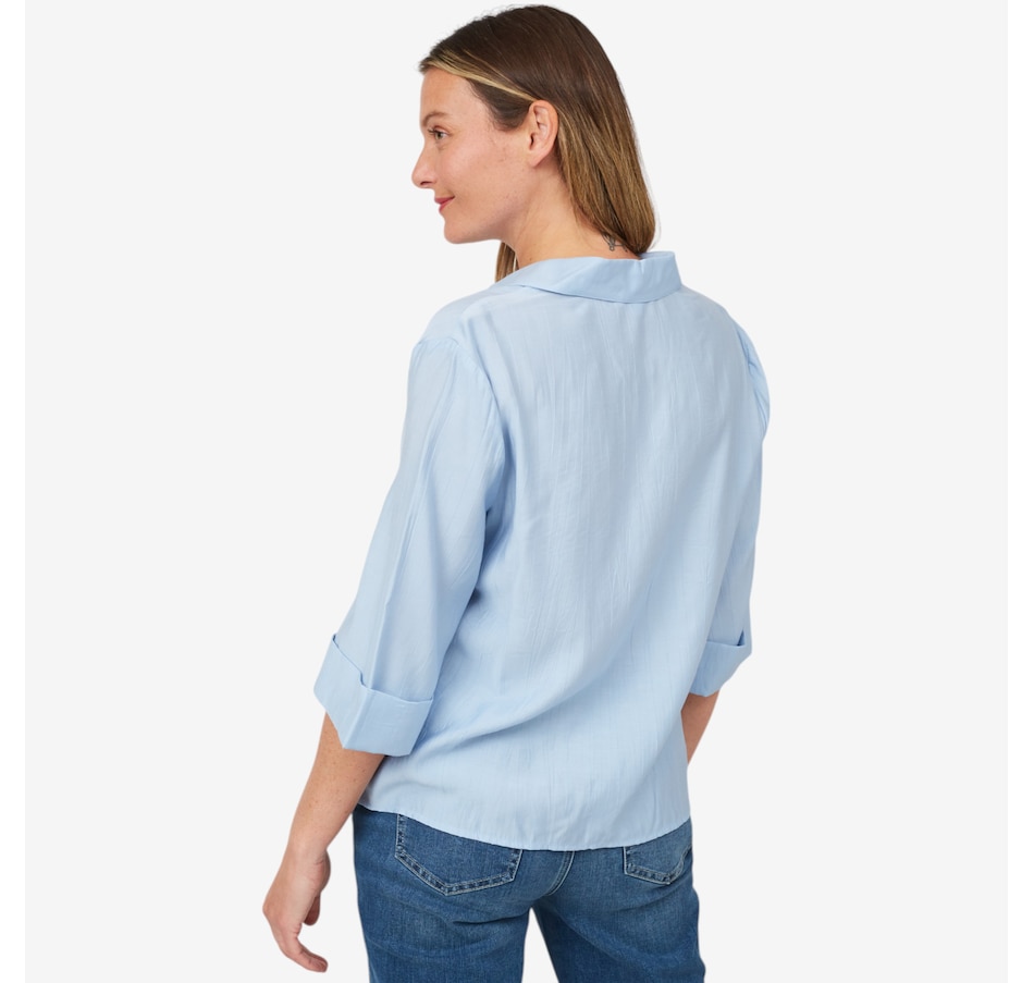 • Semi-fitted, long sleeve, button and tie front, cuffed sleeves, collar
