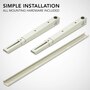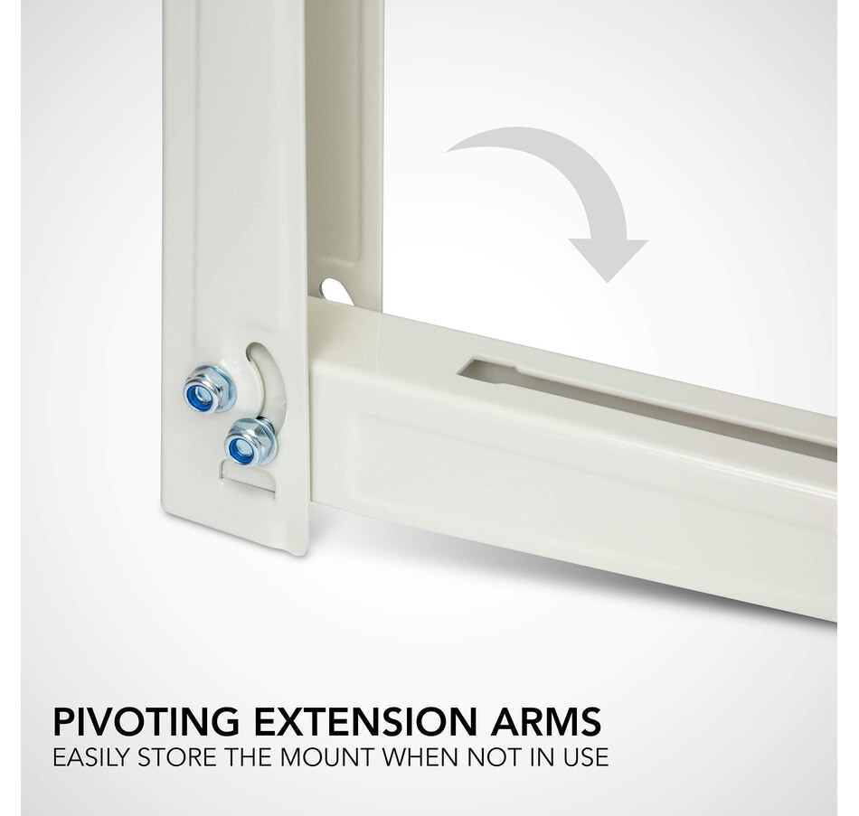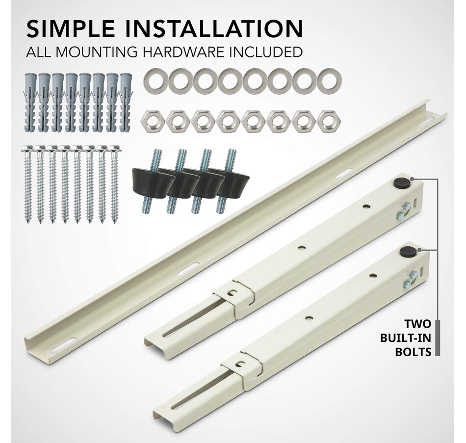- Wall mounting set with hardware, pivoting arms, and easy storage.