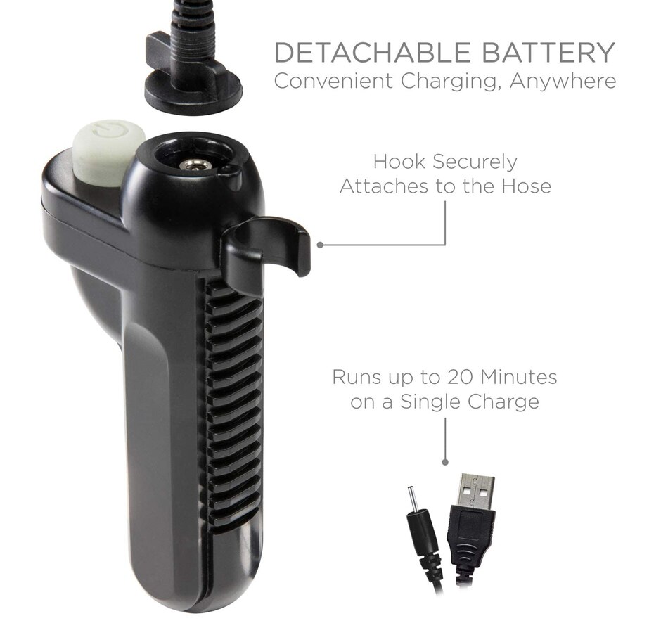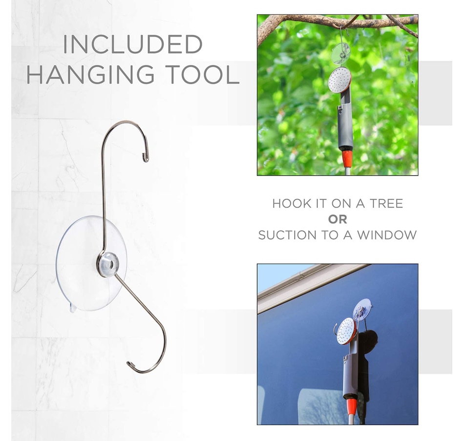 Lightweight and energy efficient, the portable shower head with hose runs on a rechargeable battery and requires no complex hookups or additional equipment. All you need is a bucket of water and you’re in business. For a true hands-free experience, the kit also includes a handy ‘S’ style hook system and suction cup for hanging the shower head from above.