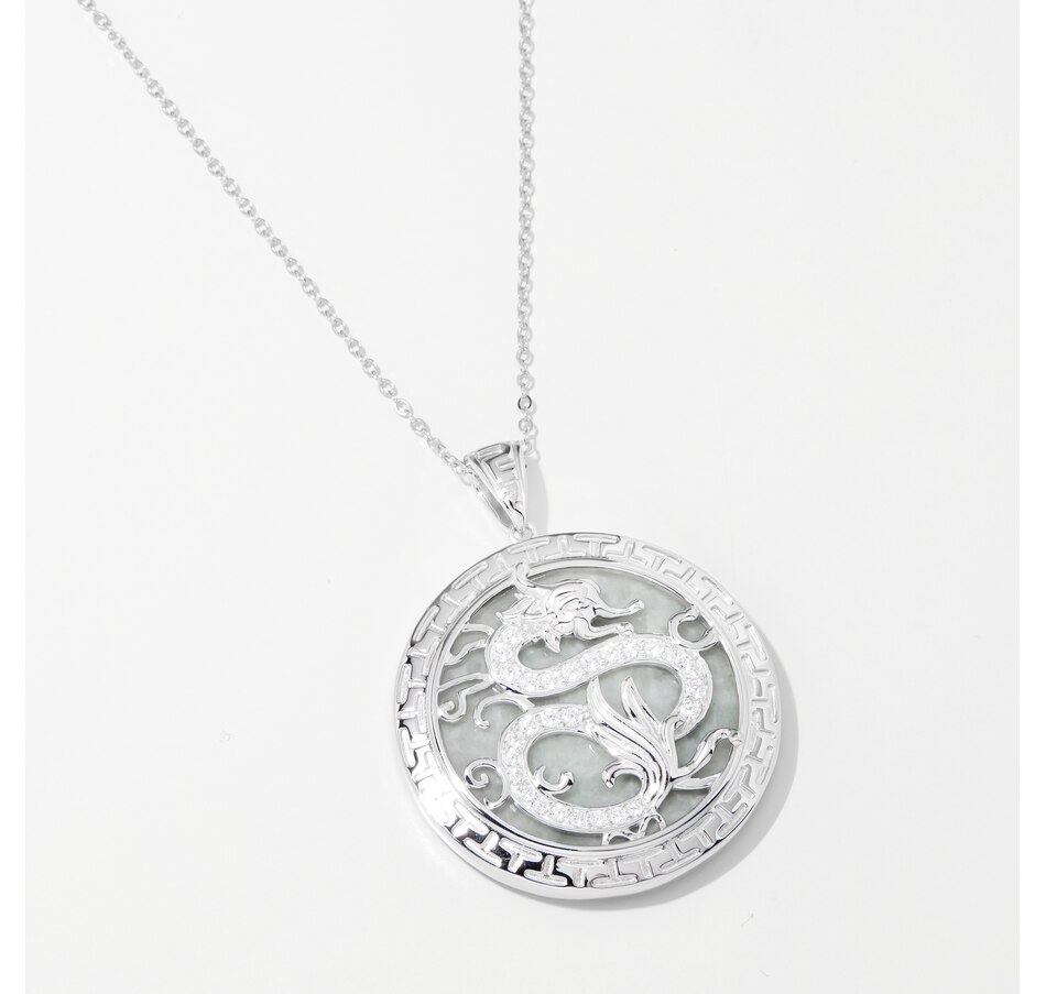 Sterling Silver Genuine Jade Circular Dragon Pendant With Chain