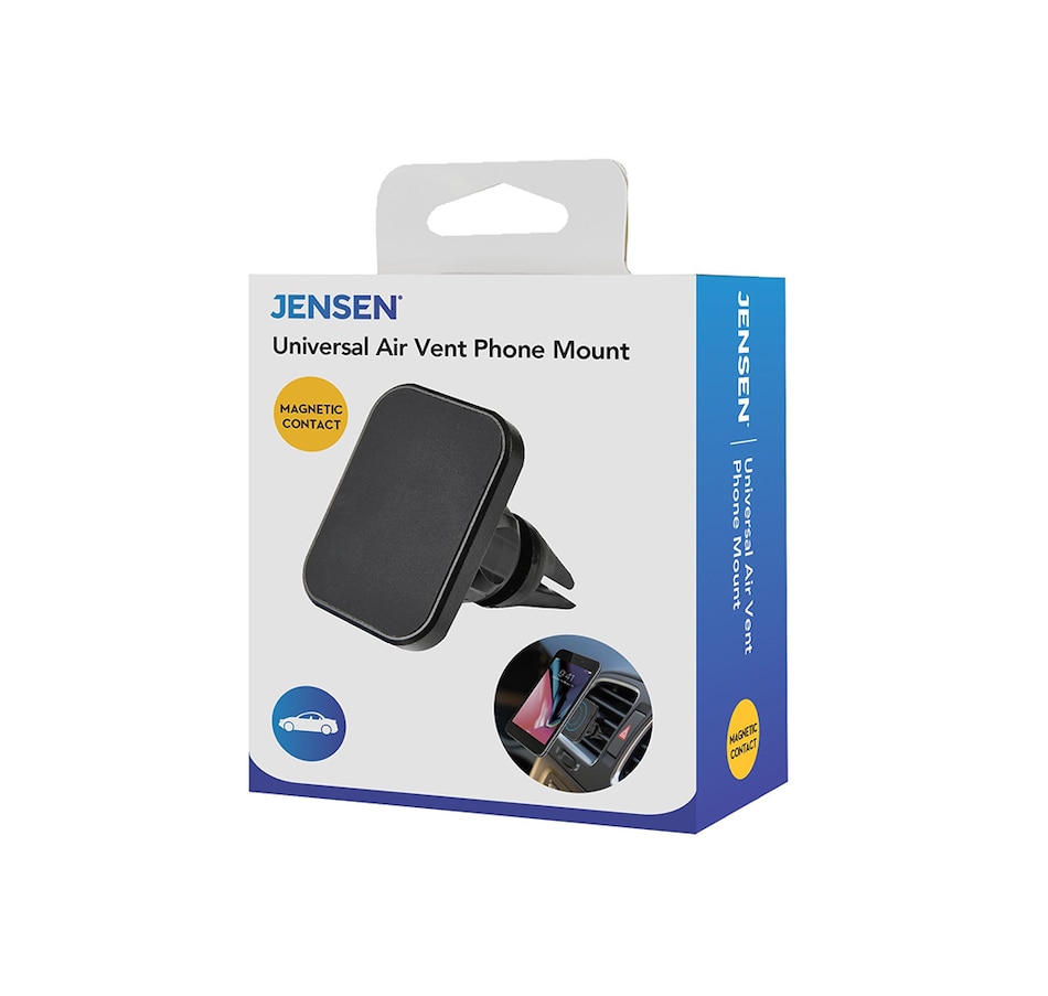 Keep your phone securely in one place with Jensen's universal air vent phone mount. It clips magnetically to your phone and latches to your car's air vent so you can do less searching and fumbling when you need to check your GPS.