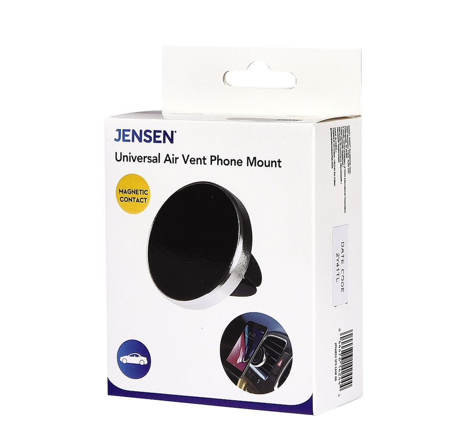 Keep your phone securely in one place with Jensen's universal air vent phone mount. It attaches magnetically to your phone using the provided sticker and latches to your car's air vent so you can do less searching and fumbling when you need to check your GPS.