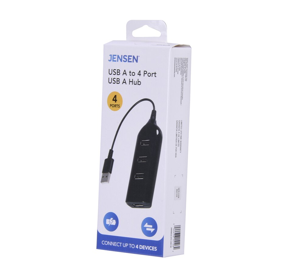 Jensen brings you this compact, portable solution that helps you turn one USB A port into a 4-port connection point. Now you can connect and use up to four devices at once from a single USB A port. Get high speed connection anytime, anywhere for all your compatible devices. Jensen's USB A to 4-port USB A hub is perfect for travel, work, and all your activities in between.