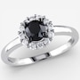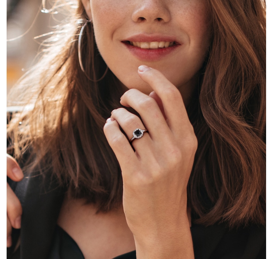 This ring showcases the striking contrast of a faceted black diamond surrounded by the refined sparkle of white diamonds in a classic halo design. The polished white gold enhanced with dark rhodium accents adds depth and dimension, giving the piece a bold yet elegant presence. Smooth and sophisticated, it brings a dramatic touch to any jewellery collection.