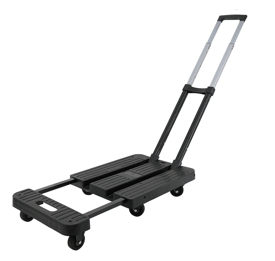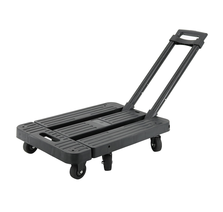 No more heavy and unwieldy hand truck and just try our collapsible lightweight trolley. The performance collapsable trolley with a lengthening adjustable placing platform shows its outstanding capacity. Six heavy duty load-bearing axles wheels for easy moving. With the comfortable grip and telescopic handle, it aims to make your small move easy and convenient. This sturdy trolley is very practical and mutli-functional like transporting heavy barrelled water or soil while gardening and more..Durable - The folding hand truck is made of extra strength polypropylene to withstand heavy loads, despite its lightweight. And the heavy iron-made drawbar makes the hand truck easy to maneuver..Lightweight and Sturdy. Hold capacity 132lb (60KG). Premium bearing wheels for strength and easy maneuvers..Six omnidirectional spinner wheels make it easy to pull or push with minimal effort..Collapsable - can be folded with ease to only 4.5 inches thick. It fits perfectly in your garage, carry bag or car trunks.