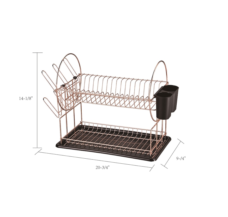 A perfect addition to any kitchen, 2-Tier Space saver dish rack with rubber feet to increase the storage capacity and protect countertop from scratches. Second tier rack provides extra space for glasses and mugs. Place cutlery in the removable utensil holder. Stainless steel rust resistant wire . 2 Compartment utensils holders to holds knives, forks and more. Spacious cup holders for mugs and wine glasses etc...The dish rack is made of the high quality stainless steel, firm, durable, rust proof and easy to clean, very ideal for dishes and cookwares etc..Detachable top rack for holding plates while the bottom rack can be used for dishes, bowls and cookwares. Practical design maximizes number of tablewares: cups, knifes, forks and cutting board on both sides..The drain tray collects water from the cutlery tray across from the cup racks to keep your kitchen clean and dry. Tray is removable for easy cleaning. Easy to disassemble and clean the water stains. Removable utensil holder for easy cleaning..Measurements: 20x9x14"H