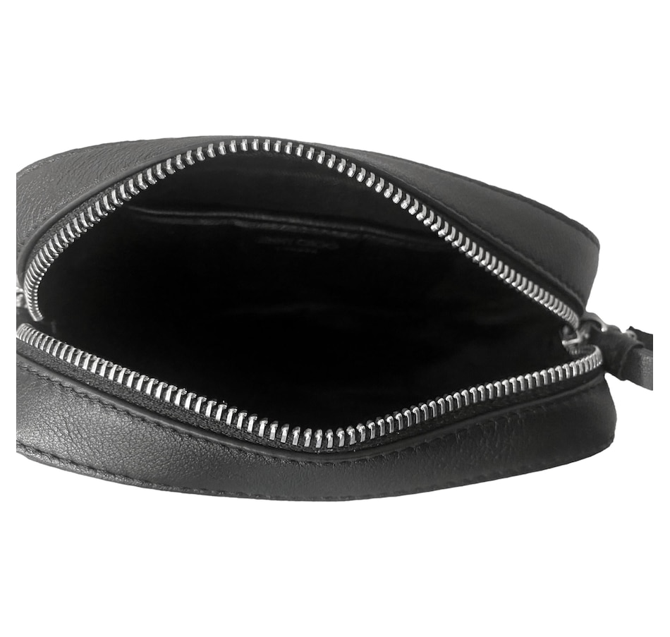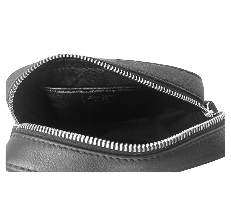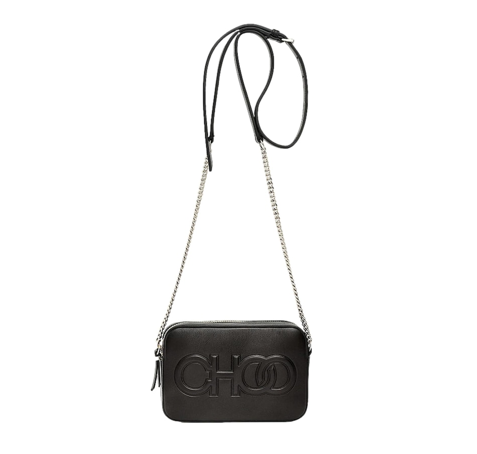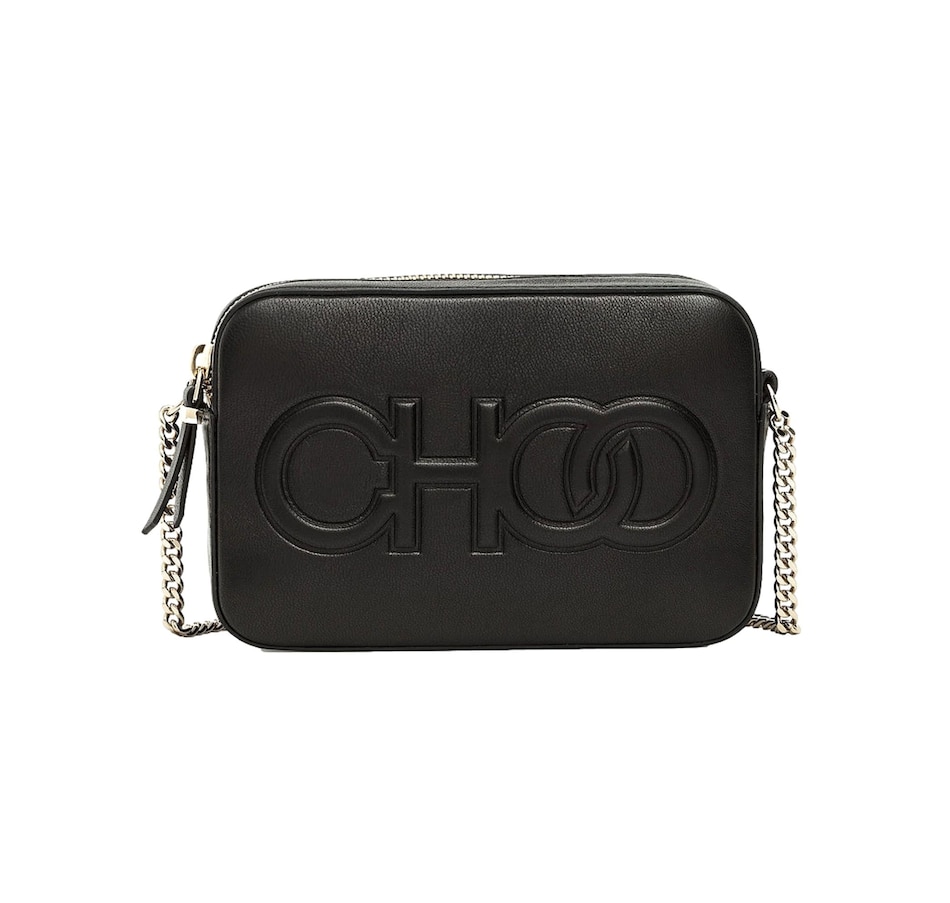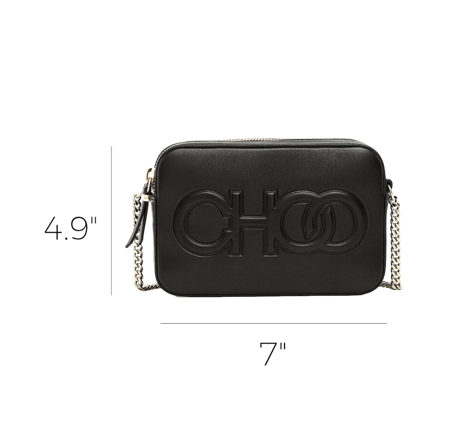 Introducing the Jimmy Choo Balti Embossed Black Leather Camera Crossbody Bag. This sleek crossbody is crafted of black calfskin leather and features a front flap with an embossed "CHOO" logo. The zipper opens to a compact black fabric interior with a slip pocket. This chic piece is perfect for any ensemble whether you are dressing up or down. Suitable for any occasion, only from Jimmy Choo.