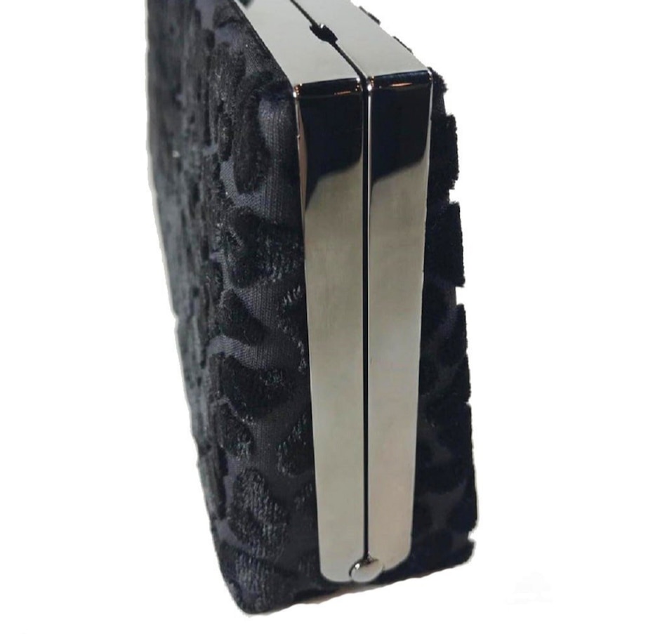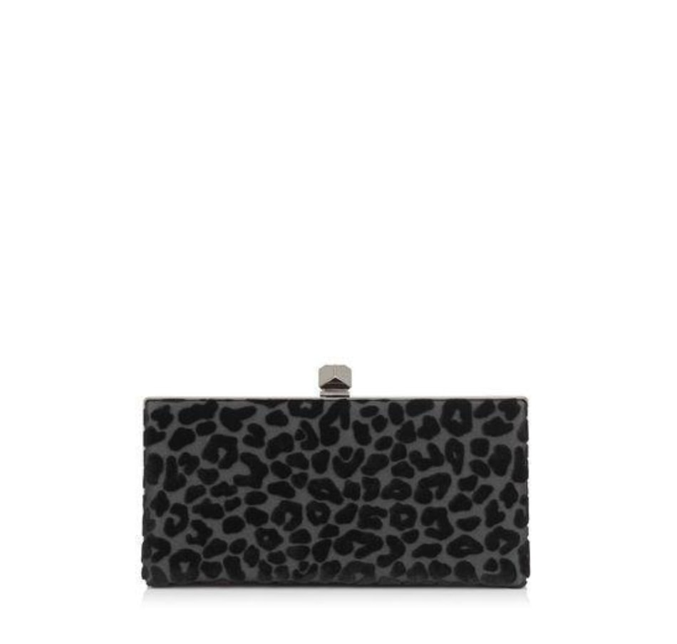 This soft and beautiful black Jimmy Choo bag is the perfect choice for a night out and is sure to turn heads. The velvet leopard print is soft, sweet and fuzzy yet sassy, and you have the option to wear the purse on a chain or as a clutch! It features one internal pocket and leopard interior print. Cube clasp closure with single rhinestone embellishment. Snag this chic and sexy clutch for your next event!