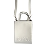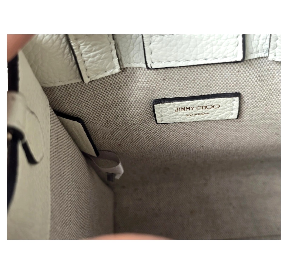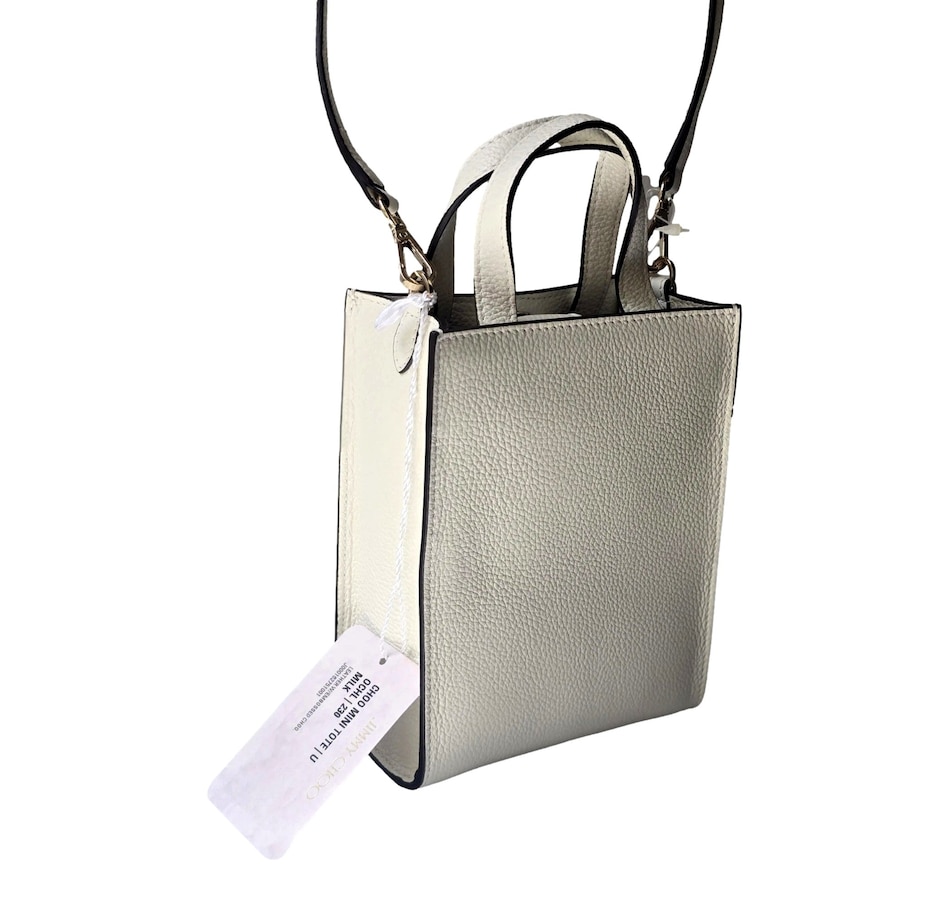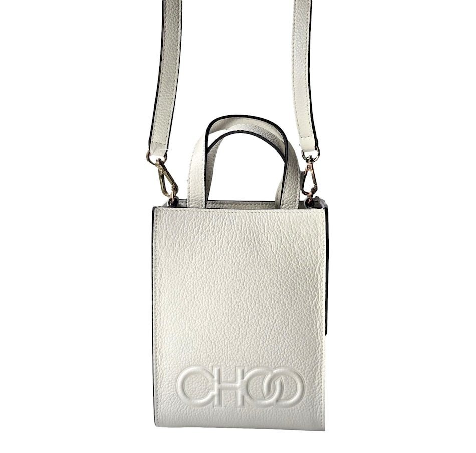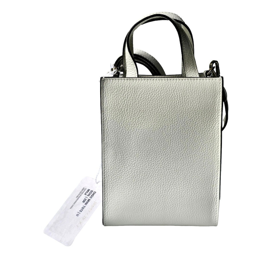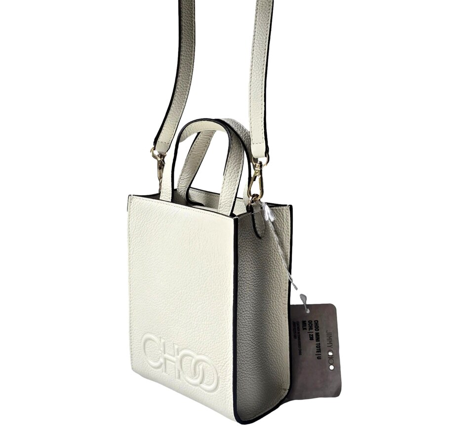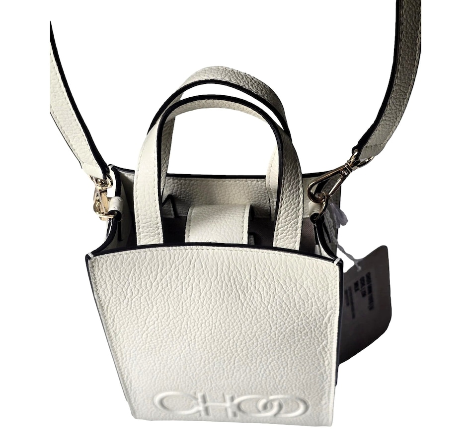 Sleek, sculptural, and effortlessly chic—the Jimmy Choo Mini Shopper in white embossed leather is a masterclass in understated luxury. Designed for the woman who moves with purpose and elegance, this compact handbag captures the brand’s signature glamour in a modern, minimalist silhouette. Crafted from supple white leather with a subtly embossed all-over Jimmy Choo logo, the piece speaks volumes through its refined texture and impeccable attention to detail. Polished hardware and clean lines elevate the design, while dual top handles and a detachable crossbody strap offer versatile styling—whether carried in-hand or worn across the body for a more relaxed statement. Inside, the mini shopper is perfectly proportioned to hold your essentials, making it an ideal companion for both day and evening. The soft milk white hue and tonal monogram embossing exude timeless sophistication, while its compact size ensures it remains effortlessly current. From the city streets to curated evenings, the Jimmy Choo Black Mini Shopper delivers elevated style with a whisper of edge—an iconic fusion of function and fashion, redefined. Model: OCHL | 230 White Pebbled Leather  Embossed Jimmy Choo Logo  Leather Top Handles and Detachable Leather Strap Beige Canvas Interior Dimensions: 5.5" x 3" x 7" (LWH) Strap Drop: 20" Includes Jimmy Choo dustbag and authenticity cards