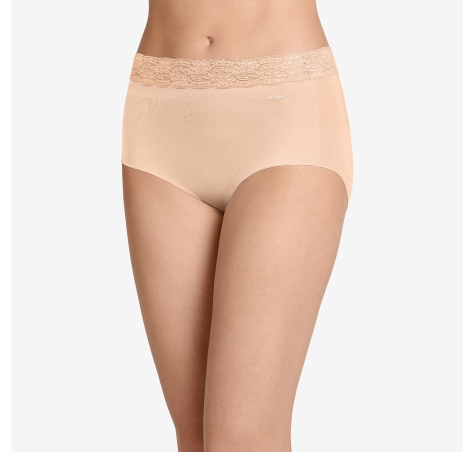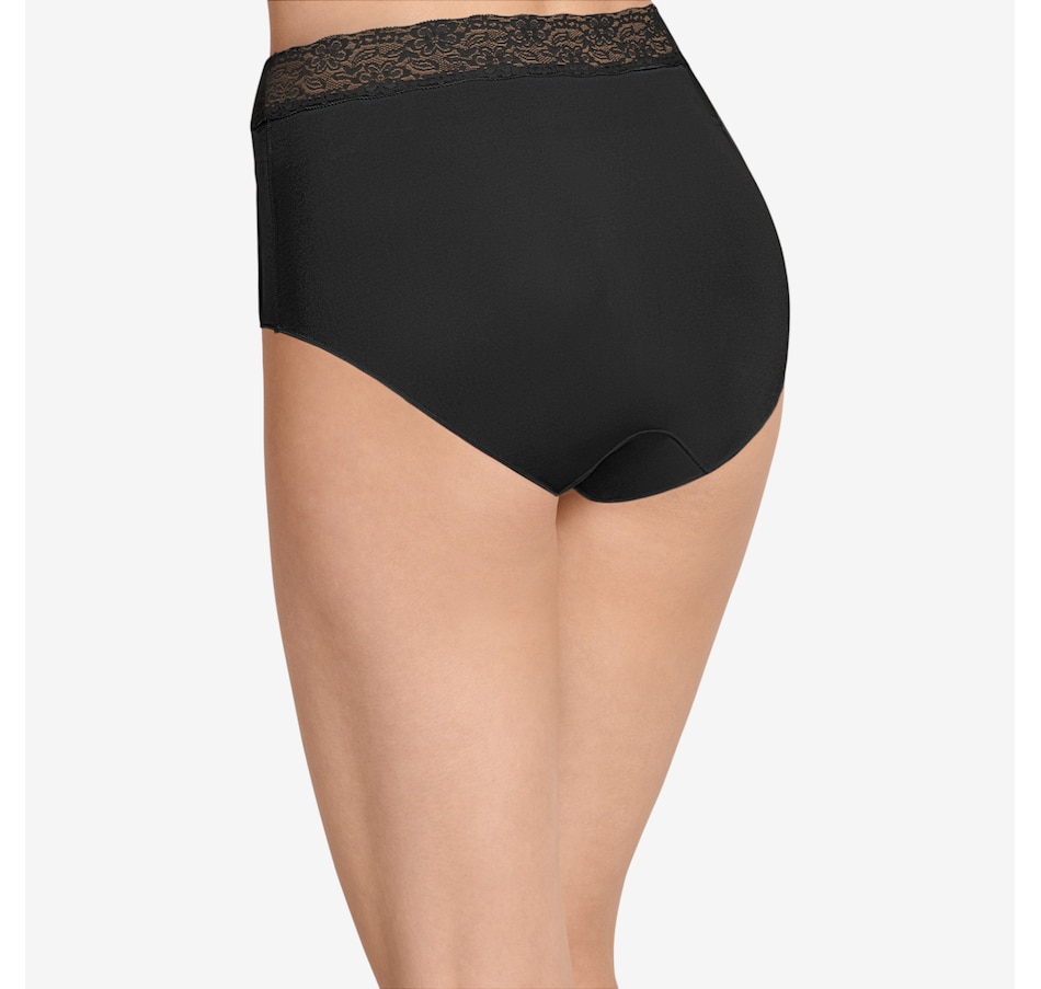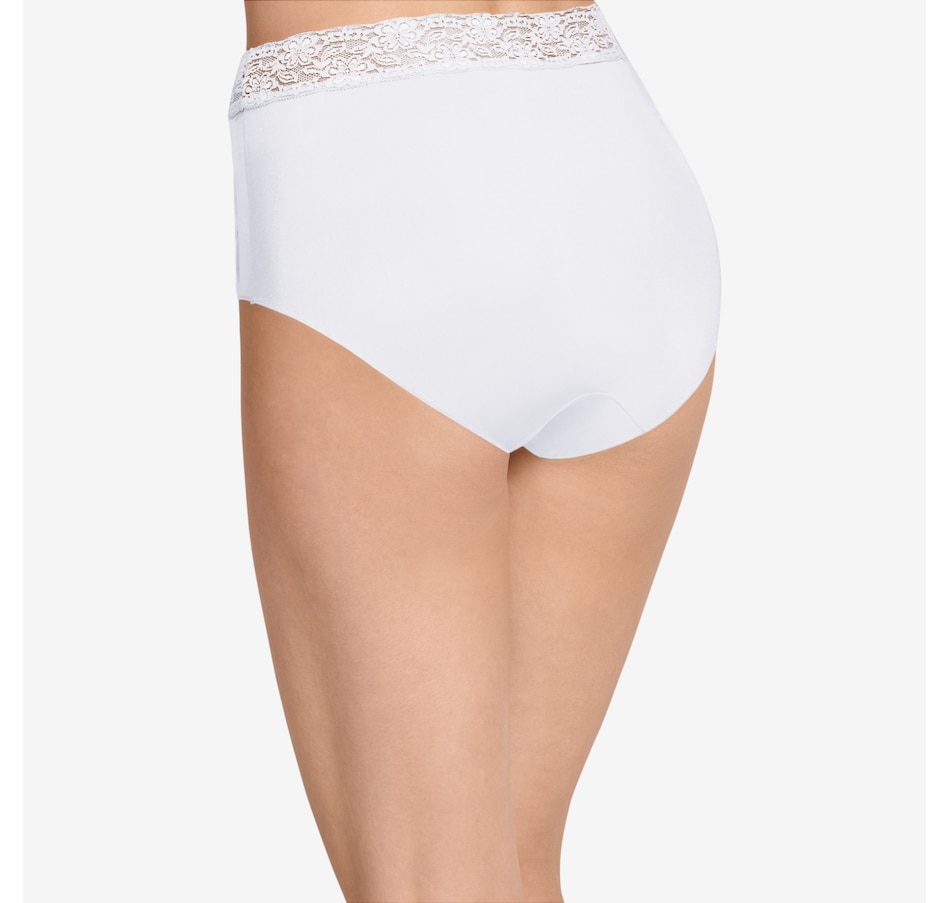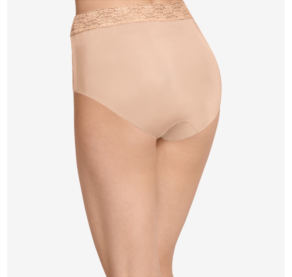 The squared-off legs of this brief feature a unique leg binding that helps eliminate panty lines. The Tactel nylon and Lycra spandex composition offer a smooth, silky feel with plenty of stretch, and the soft, wide lace waistband lies flat for all-day comfort.