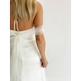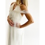 The gorgeous, sophisticated Cora from Katherine Karambelas is a floor length satin column dress designed with a bias cut, and a tulle off the shoulder that can be tied at back. There's also a halter neck tie, and it finishes with a zipper at back.