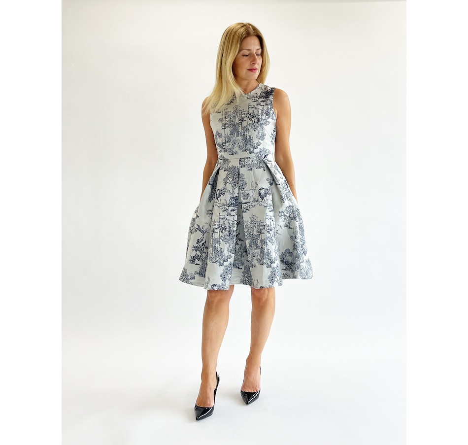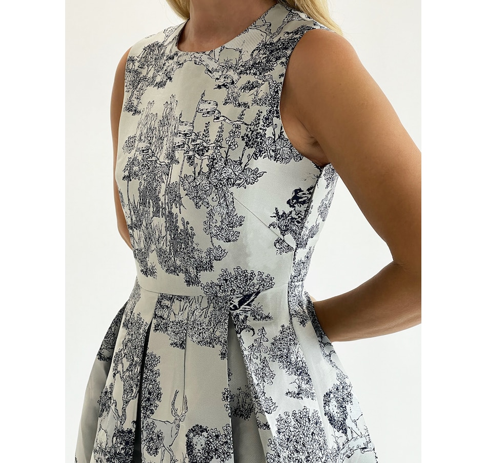 The beautiful Elodie from Katherine Karambelas is an A-line pleated jacquard dress, designed with a round neck and is sleeveless. It sits at an above the knee length, and finishes with a zipper at back and pockets on side.