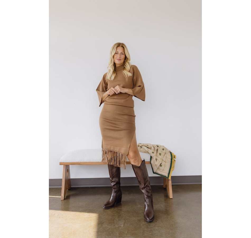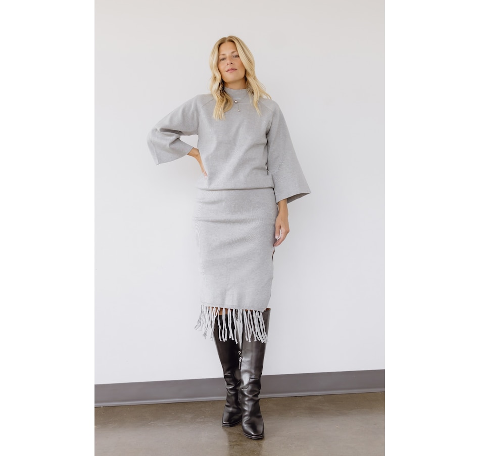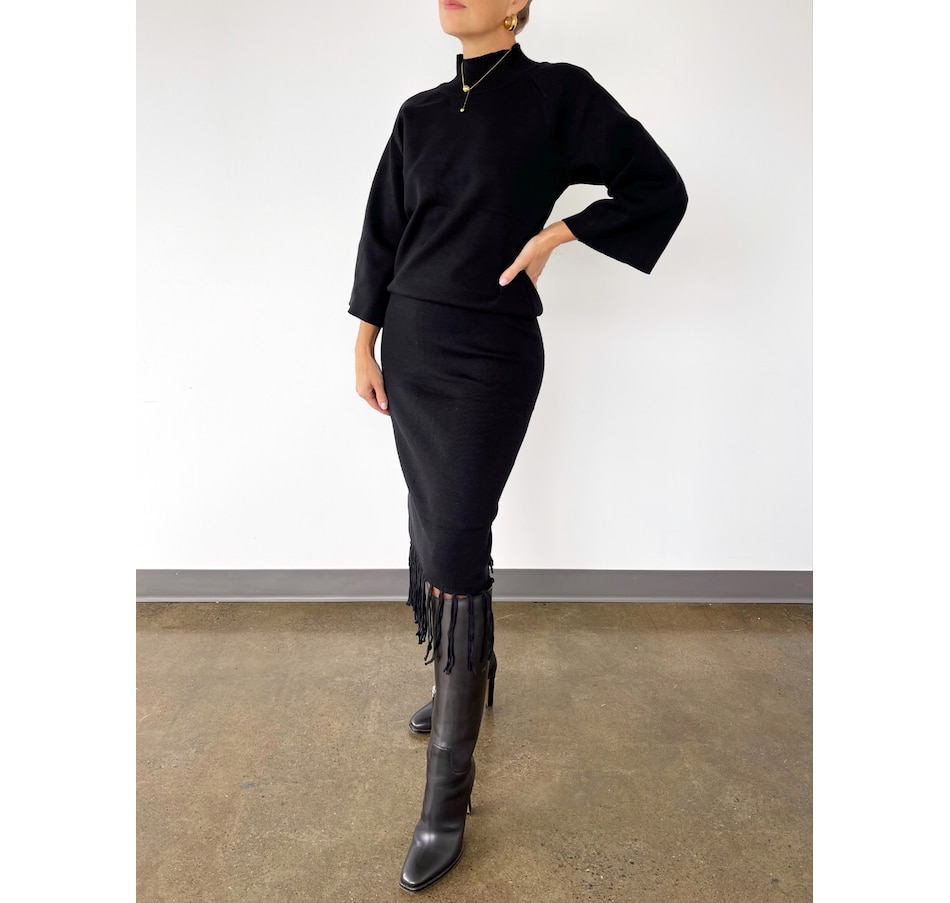 • Mock neck top is elbow length sleeve, tassel detail on mid-calf skirt, stretched rib knit fabric