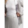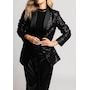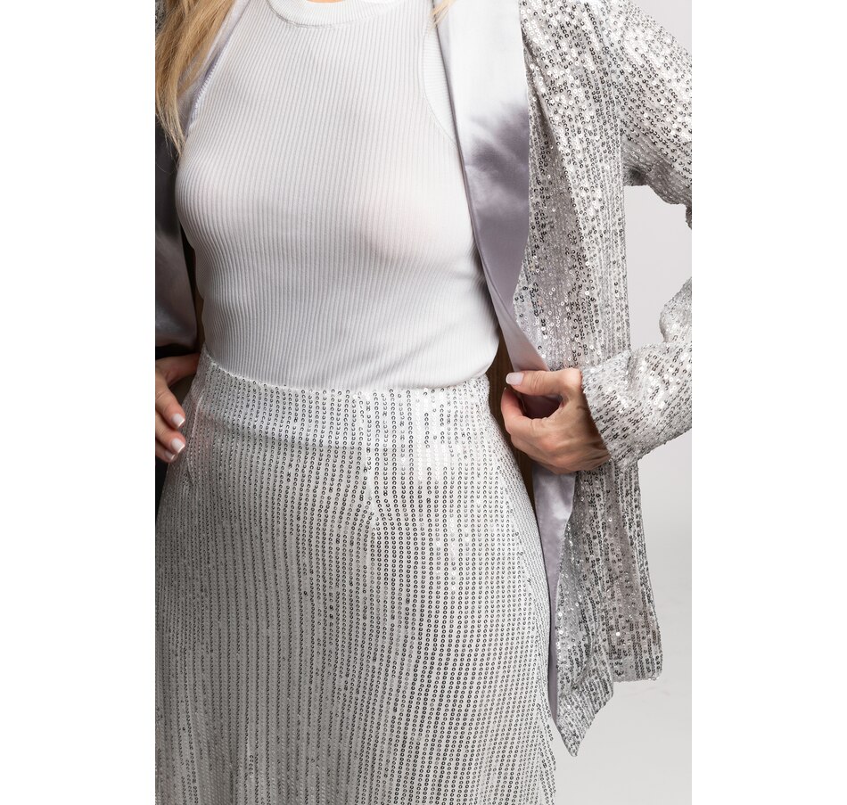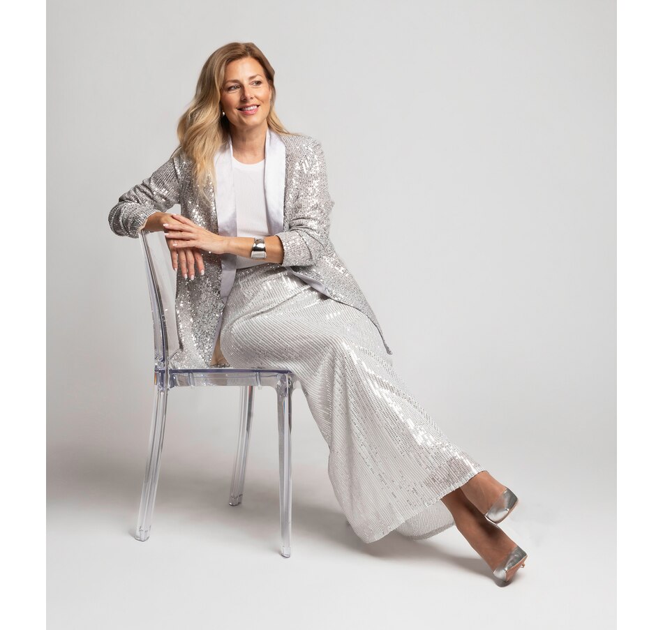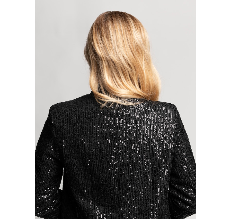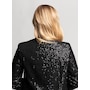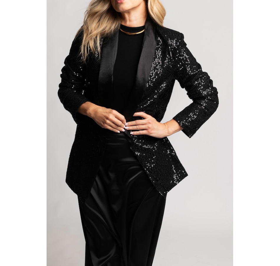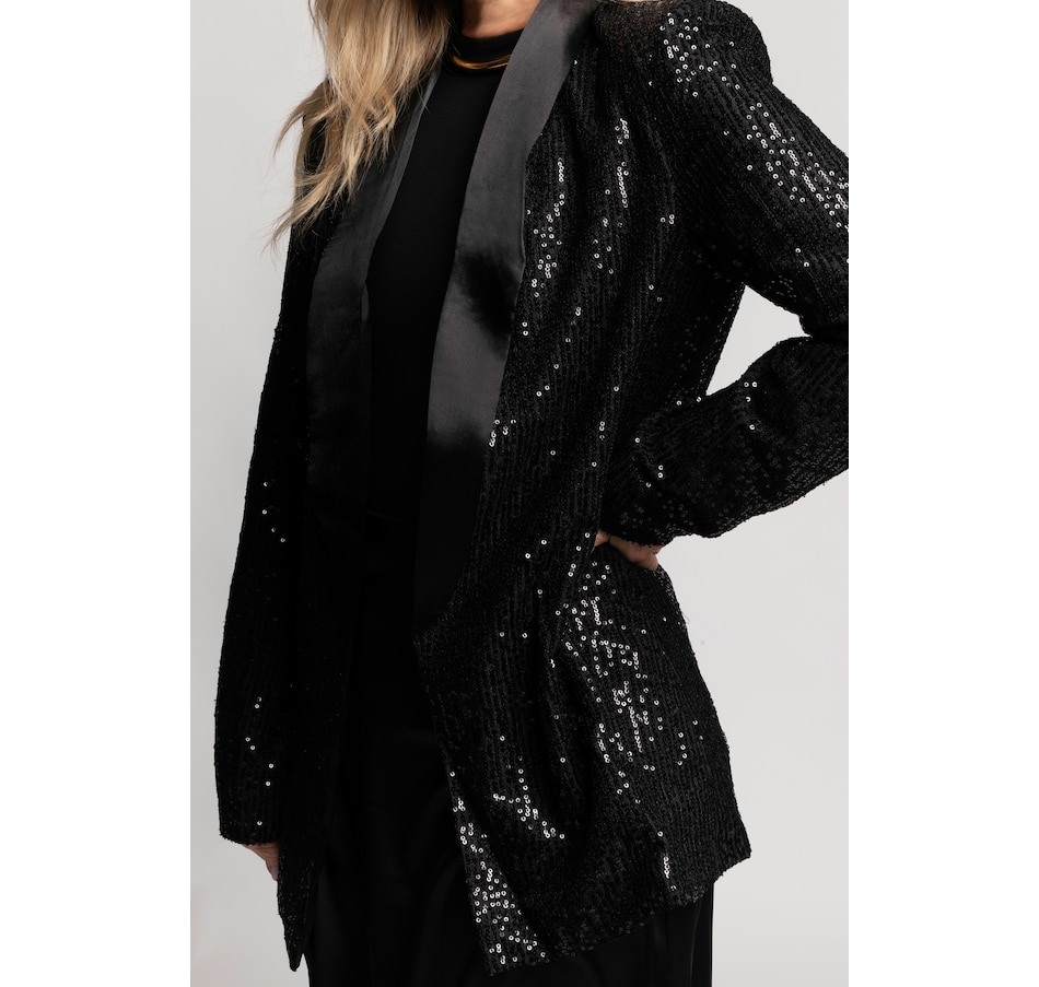 The beautiful Sasha sequin blazer from Katherine Karambelas features a satin shawl lapel, is lined, and finishes with an open front.