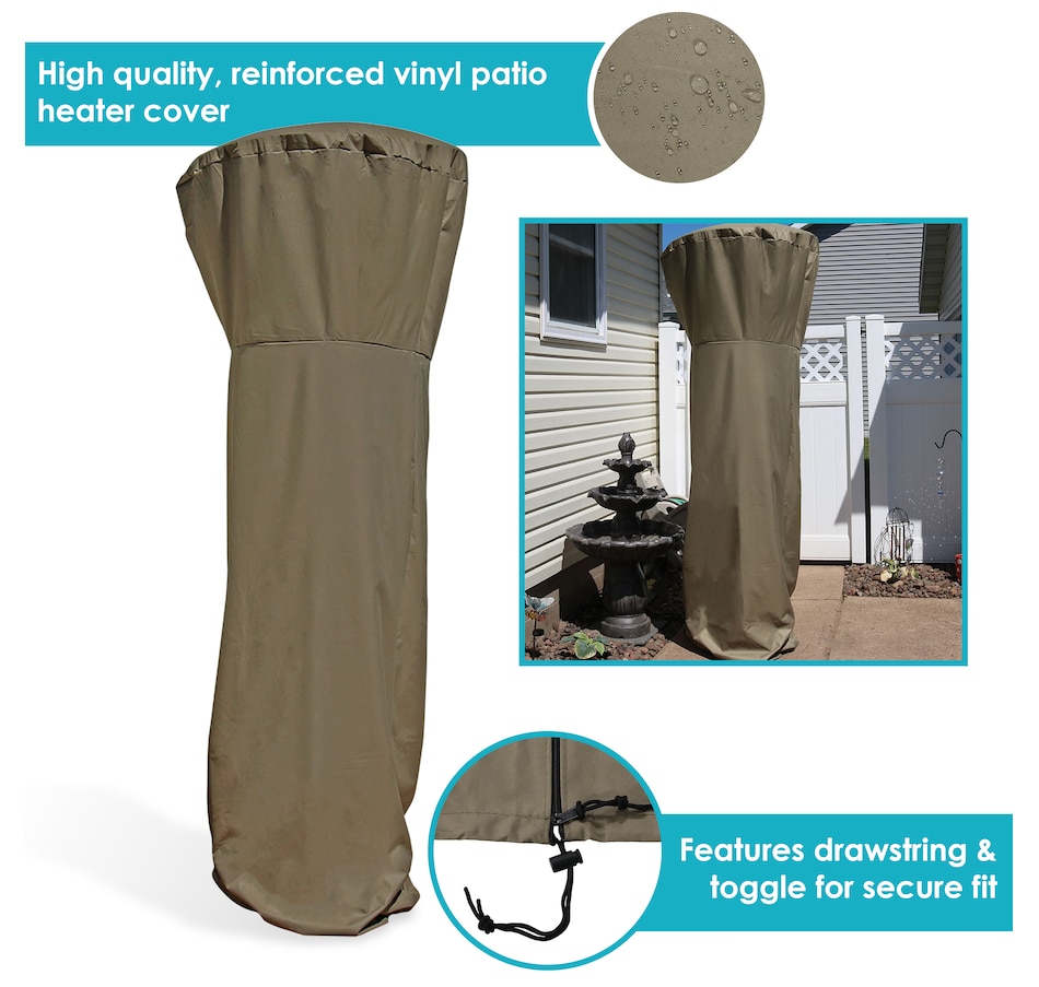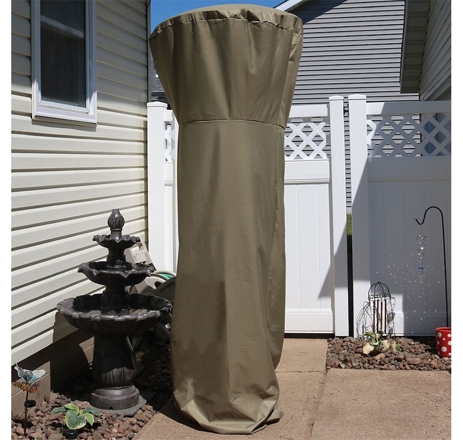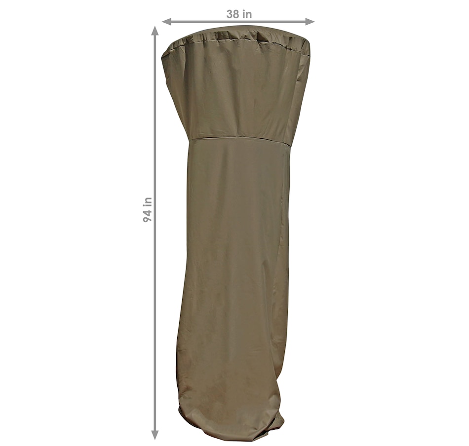 Cover a patio heater and keep it protected throughout the year despite weather, wear, and extensive use with this durable water fountain cover. Water and weather-resistant, this heavy-duty cover is made from reinforced vinyl PVC and is an easy way to protect any outdoor heater to keep warm year-round! The vinyl material ensures durability and the ability to withstand the elements. This cover is designed to fit a patio heater that spans 38" wide. It features a convenient drawstring and toggle tie at the bottom to allow the cover to adjust for a snug fit. It also has a drawstring and toggle to securely strap the cover to your patio heater. The cover measures 38" wide at the top, 24" wide in the body, and 94" tall. This cover also features a smooth zipper that opens, closes, and extends throughout the entire height of the patio heater.