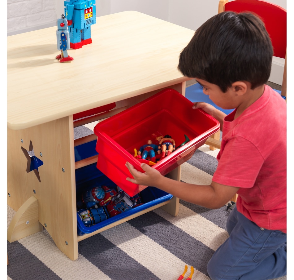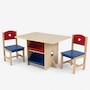Four angled bin units are situated underneath the tabletop and are perfect for holding craft supplies, crayons, toys, and more. Handy storage bins are accessible from either side of the table and removable for carrying or cleaning. The primary colours of red and blue pop against the natural background. Because of the table's wood construction, this stellar furniture set would look great in any kid's bedroom or playroom.