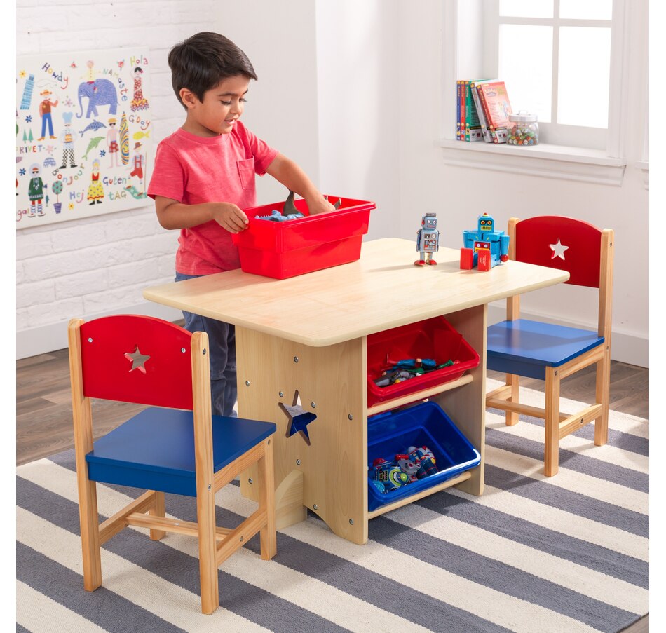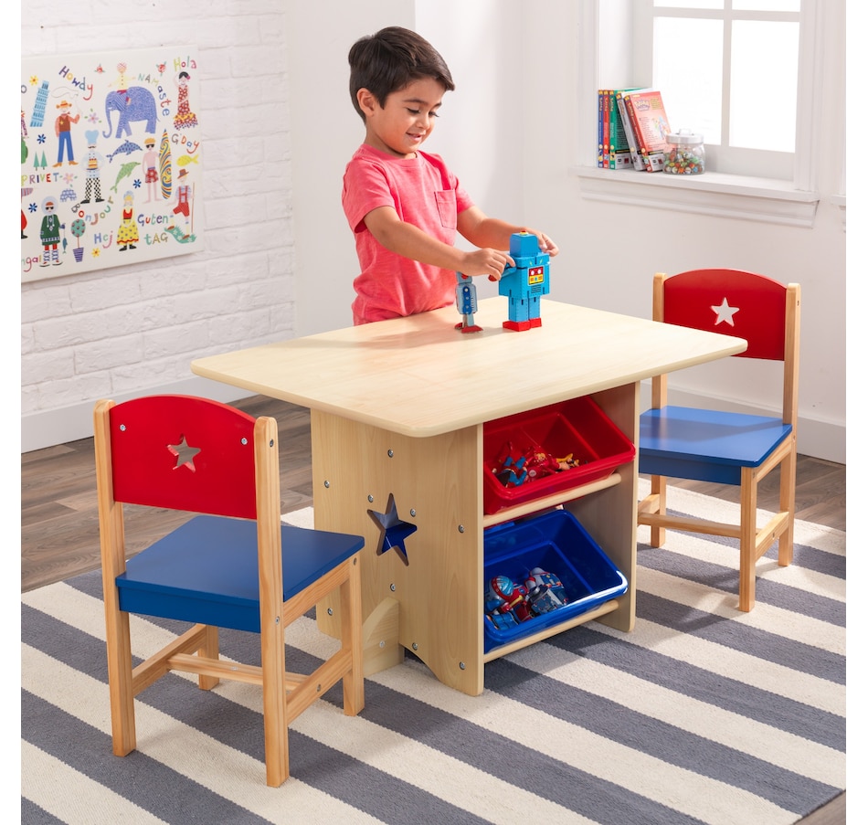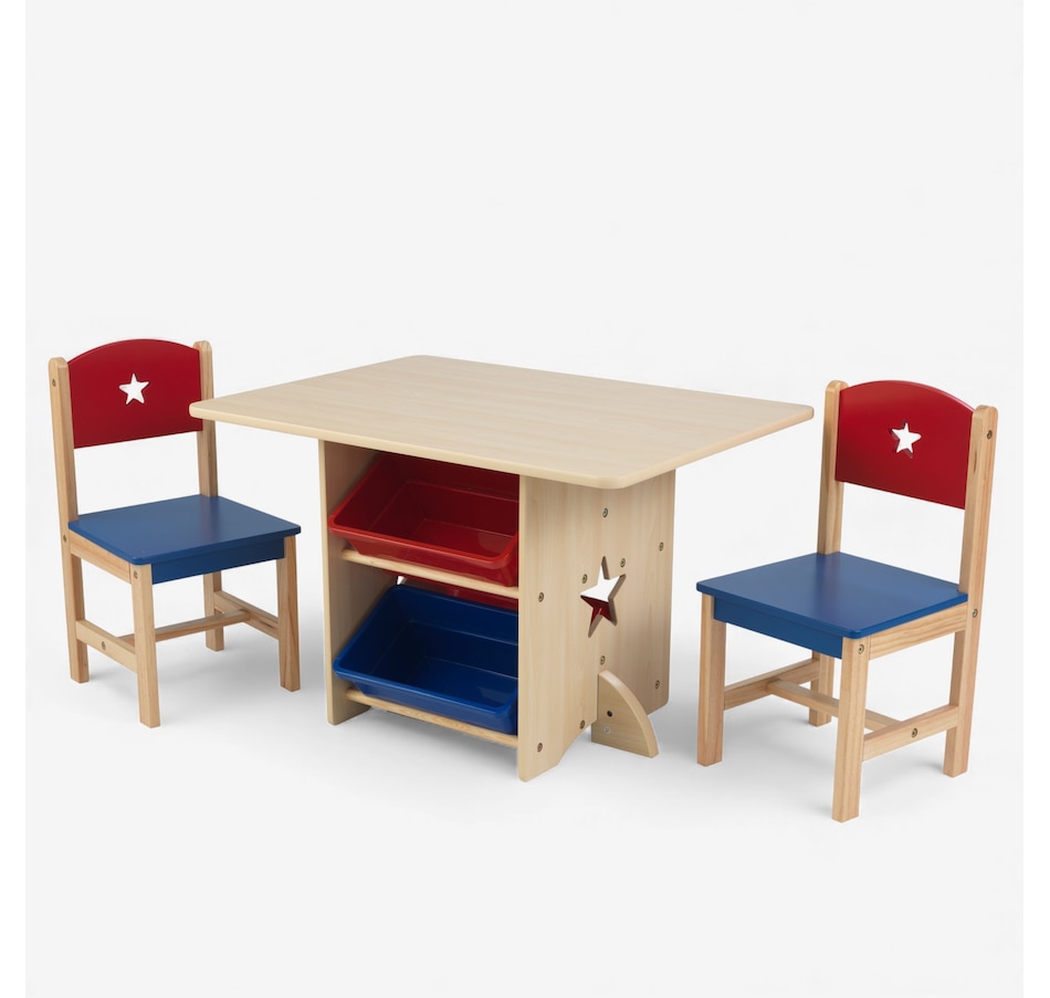 The KidKraft Star Table and 2 Chair Set is the ideal place for homework, games or arts and crafts. Uniquely designed with storage bins built into the table, this set satisfies both a need for a furniture piece and a storage spot. The rounded corners on the table provide extra safety.