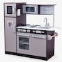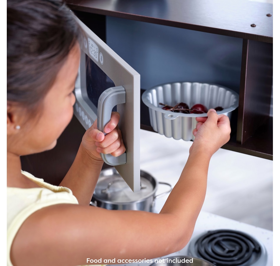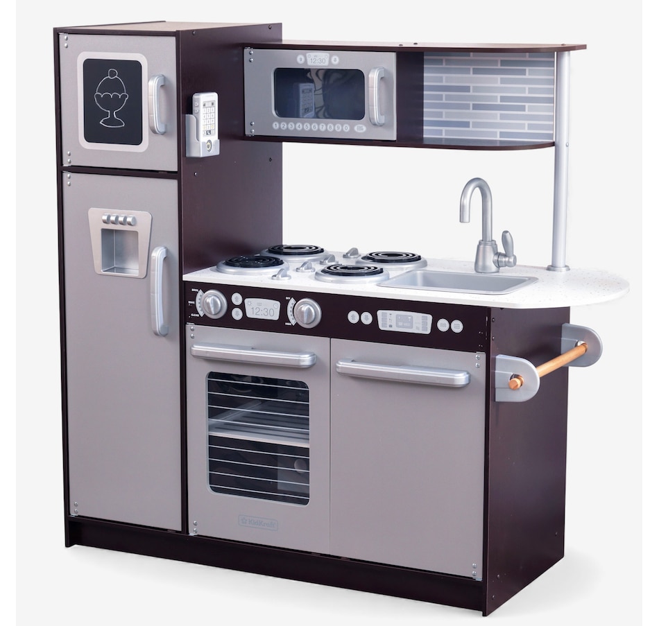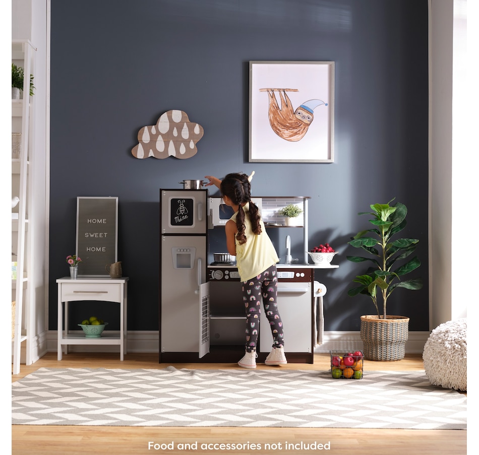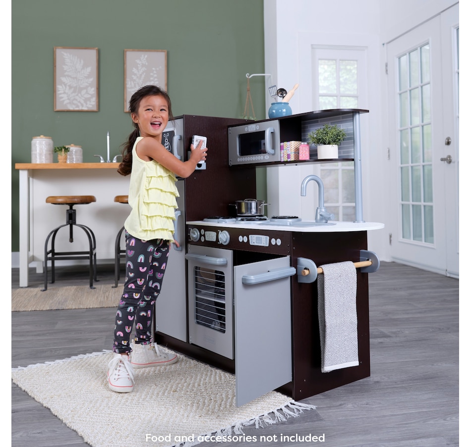 Time to cook up a little fun! This KidKraft Uptown Espresso Play Kitchen has a hip, modern look that young chefs are sure to love. With tile-look backsplash and sleek countertops, the design is emulated from trendy real-life kitchens. Every appliance is interactive, including doors that open and close, knobs that turn and click and a working chalkboard on the freezer door.