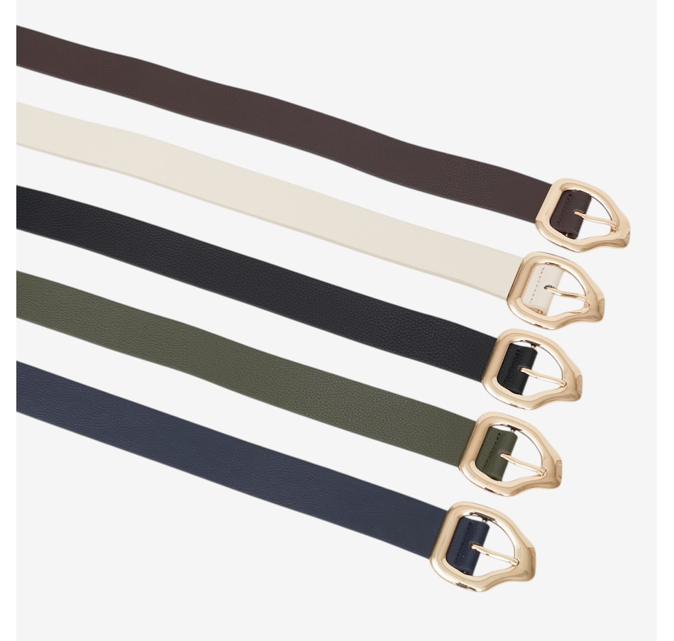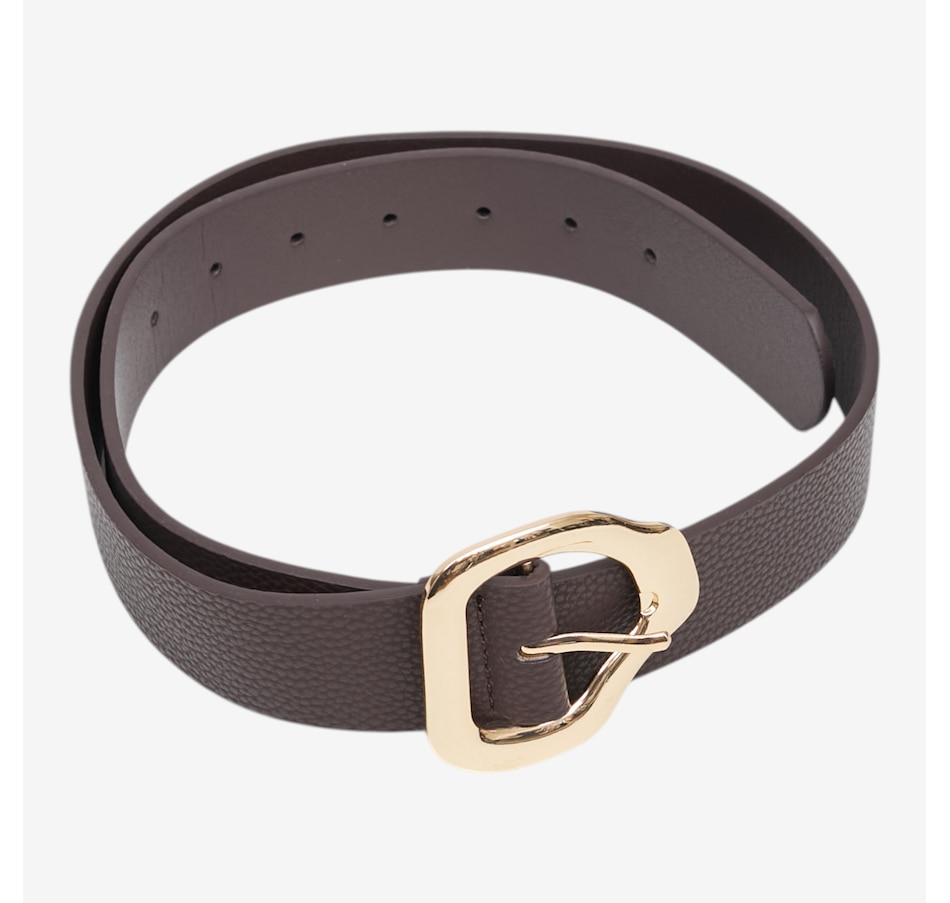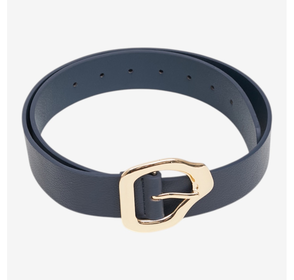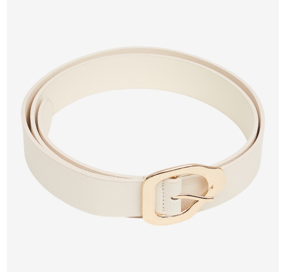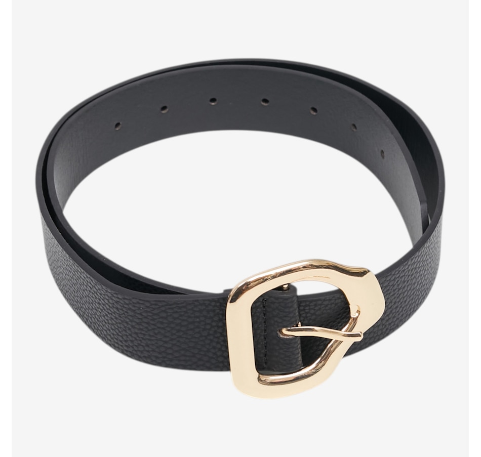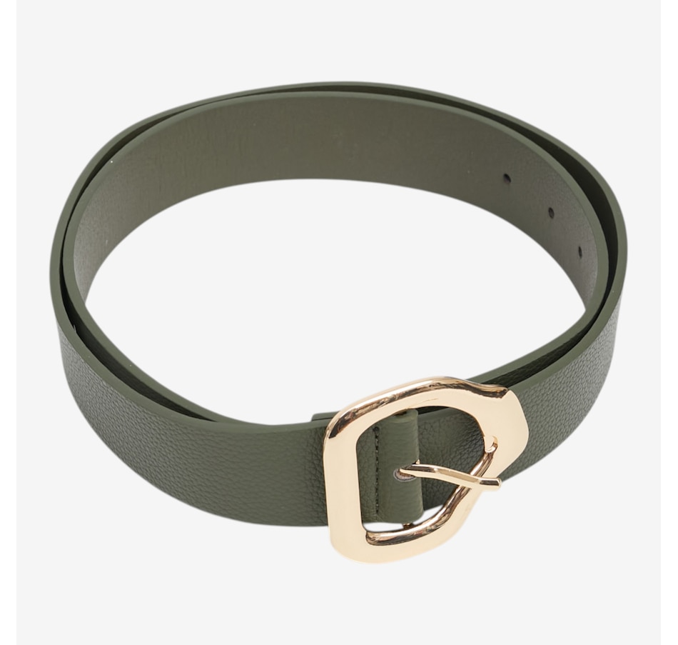 Add a touch of modern sophistication to any outfit with this abstract buckle belt from Kim & Co., a chic accessory designed to elevate your everyday style. Crafted from a trendy faux leather, this versatile belt features a striking gold abstract metal buckle that instantly draws the eye and adds a polished finish to dresses, trousers, and tunics alike. With multiple adjustment holes and availability in six sizes and a variety of colours, it offers a customizable fit that flatters every silhouette.