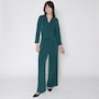 • Semi-fitted, V-neckline with faux wrap, shirring above front waistband, wide comfort waistband, pleats at front waist, pockets at side seams, contour waistband