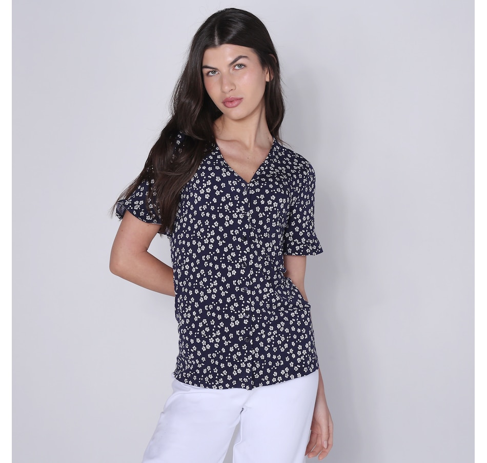 • Relaxed fit, v-neckline, full frontal button closure, frill at sleeve hem