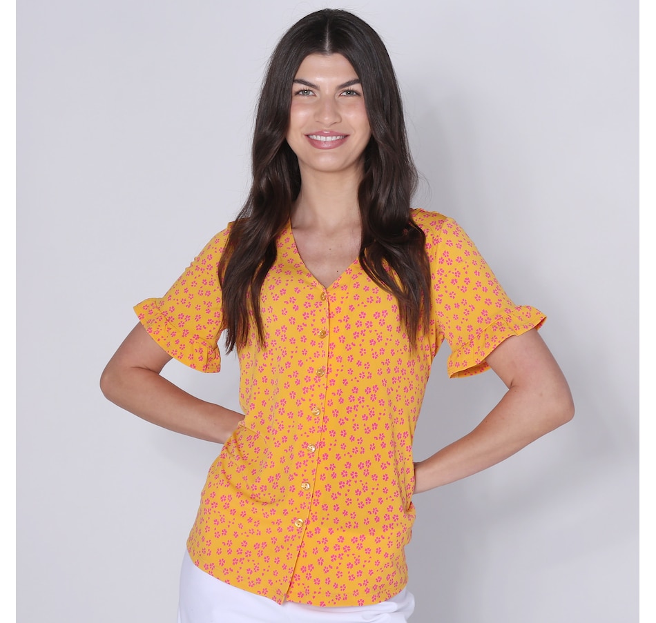 Available in a trio of different colour combinations, you'll centre all of your looks in style with this short frilled sleeve shirt from Kim & Co.