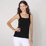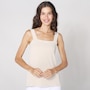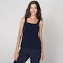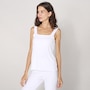 • Semi-fitted, bodice doubled in self fabric, double layer wide straps, square neckline, pull-on