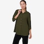 This crinkle poplin 3/4 sleeve Emma shirt from Kim & Co. is designed with a collar at the neck, a full button front closure, and ruching at the sleeve hem.