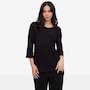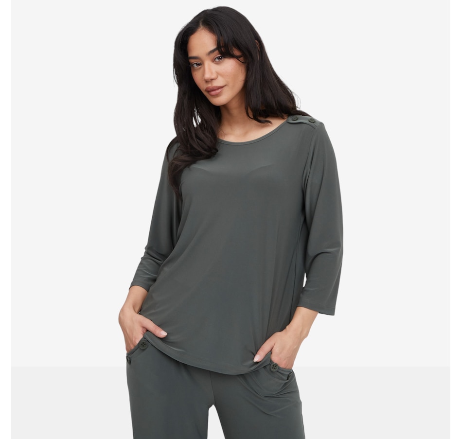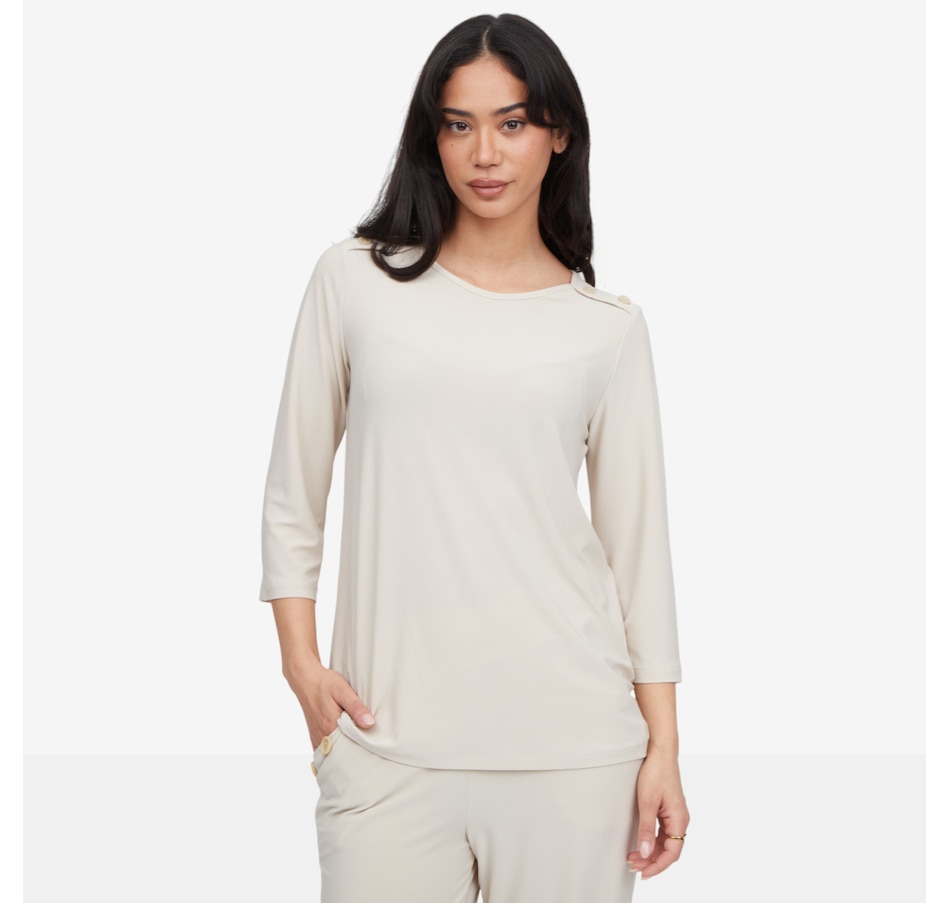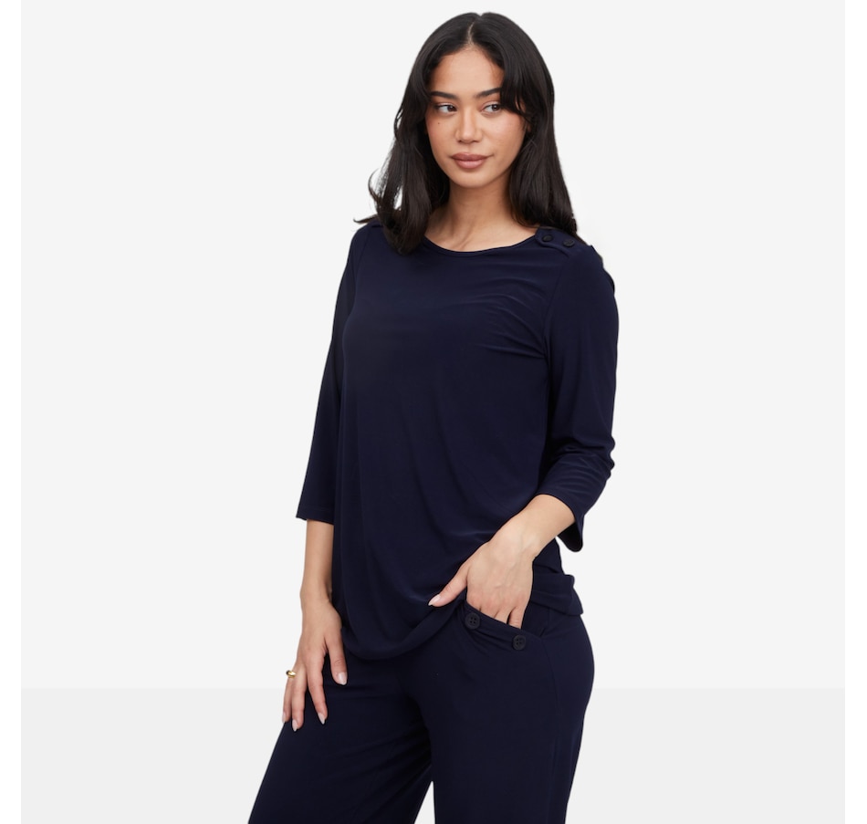 Classic, confident, and effortlessly polished, the Kim & Co. deluxe Brazil knit 3/4 sleeve sailor top brings timeless nautical style into the modern wardrobe. Featuring a flattering wide neckline and decorative dyed‑to‑match four‑hole buttons at the shoulder, this pull‑on top adds a refined sailor‑inspired touch to any outfit. The set‑in 3/4 sleeves offer comfortable coverage with a clean, tailored look, while the signature deluxe Brazil knit drapes beautifully and feels luxuriously soft against the skin.
