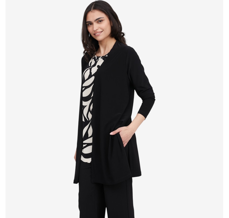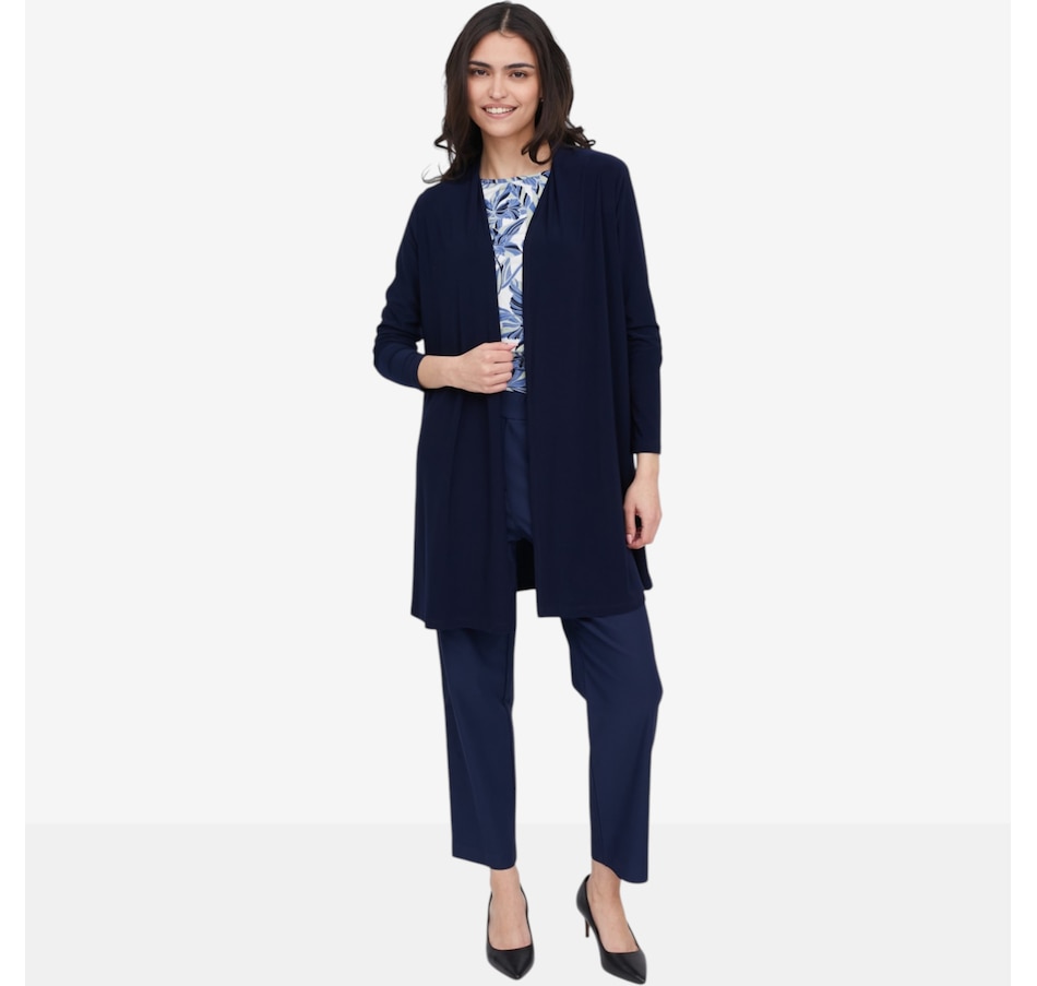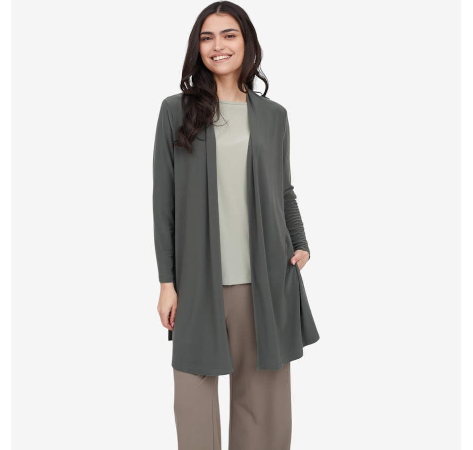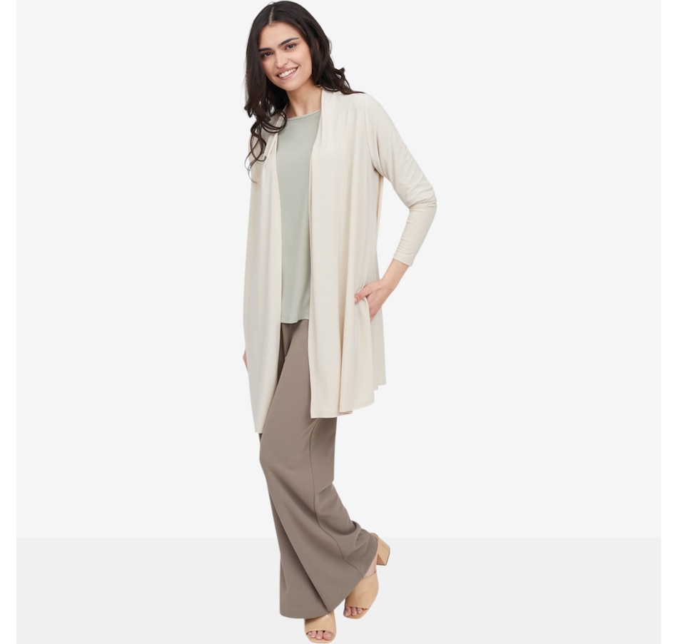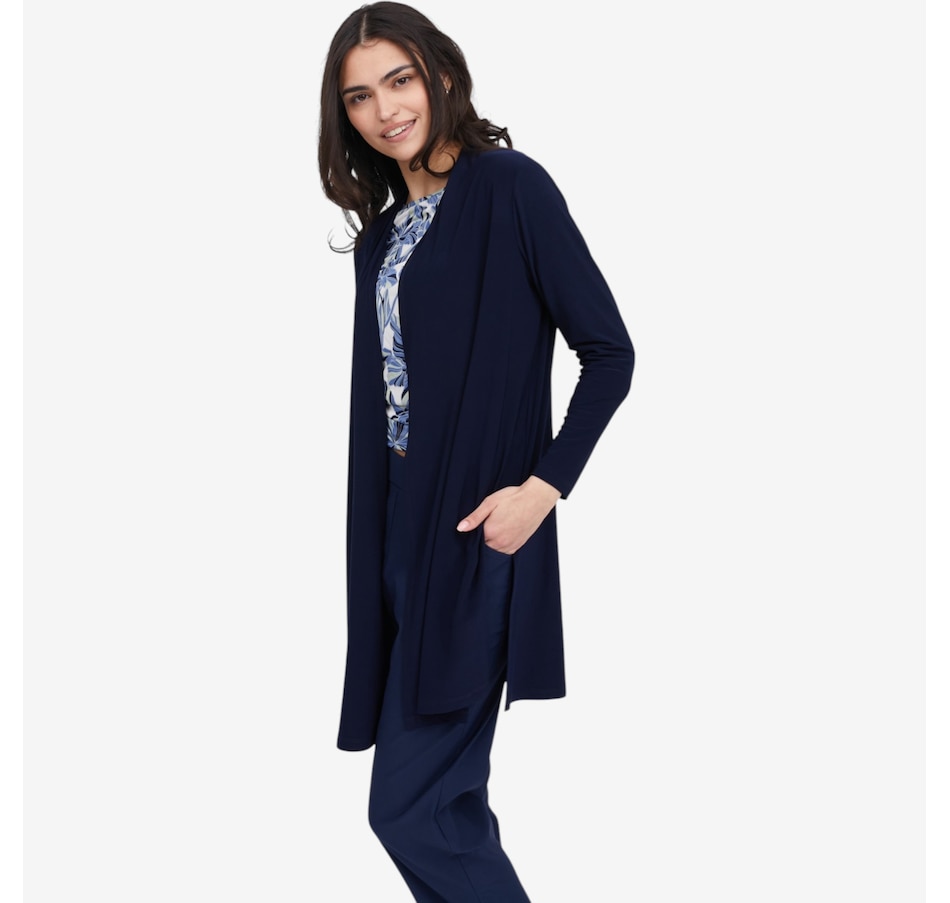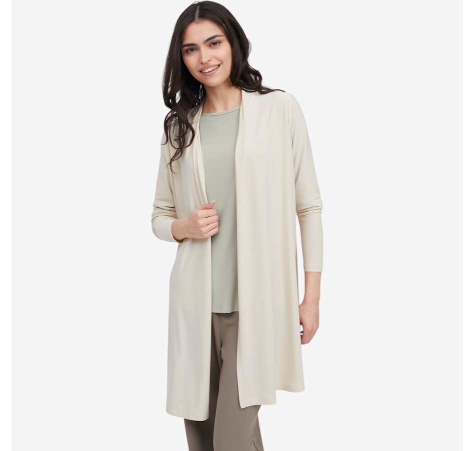 Wrap yourself in effortless sophistication with this deluxe Brazil knit long cardigan with slits from Kim & Co., a timeless layering piece designed for comfort, movement, and everyday elegance. Crafted from the brand’s signature silky‑soft Brazil knit, this above‑knee cardigan drapes beautifully while offering a higher back neckline for a cozier, more refined fit. Side‑seam slits create fluid motion and a flattering, elongated silhouette, while the double‑needle stitched hem makes for a clean, polished finish.