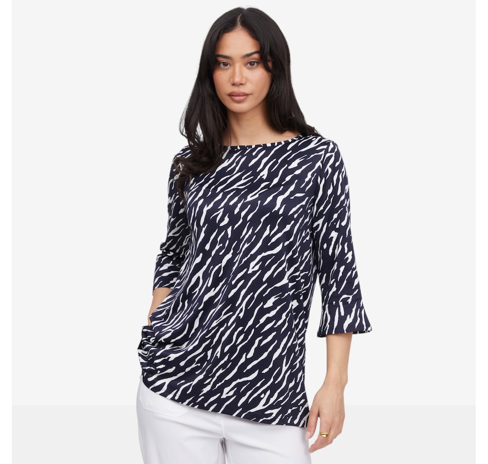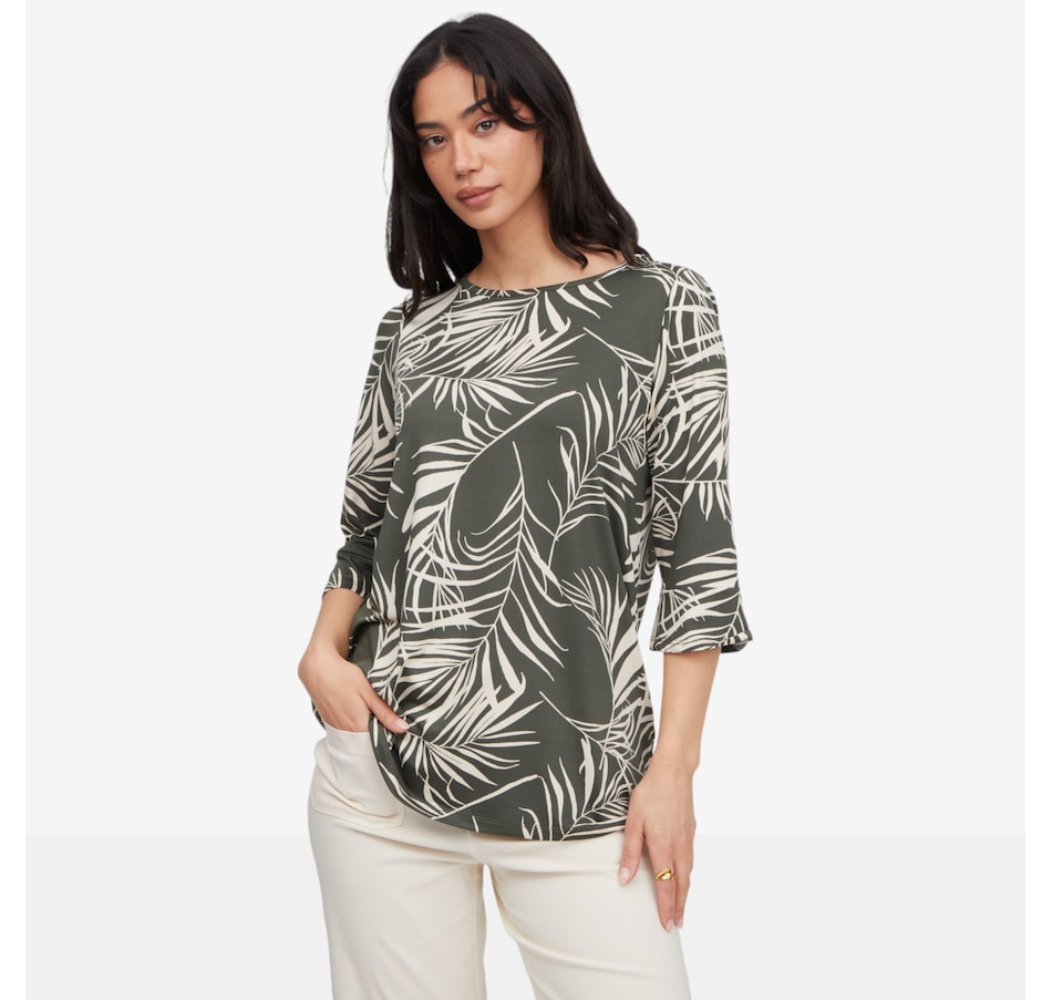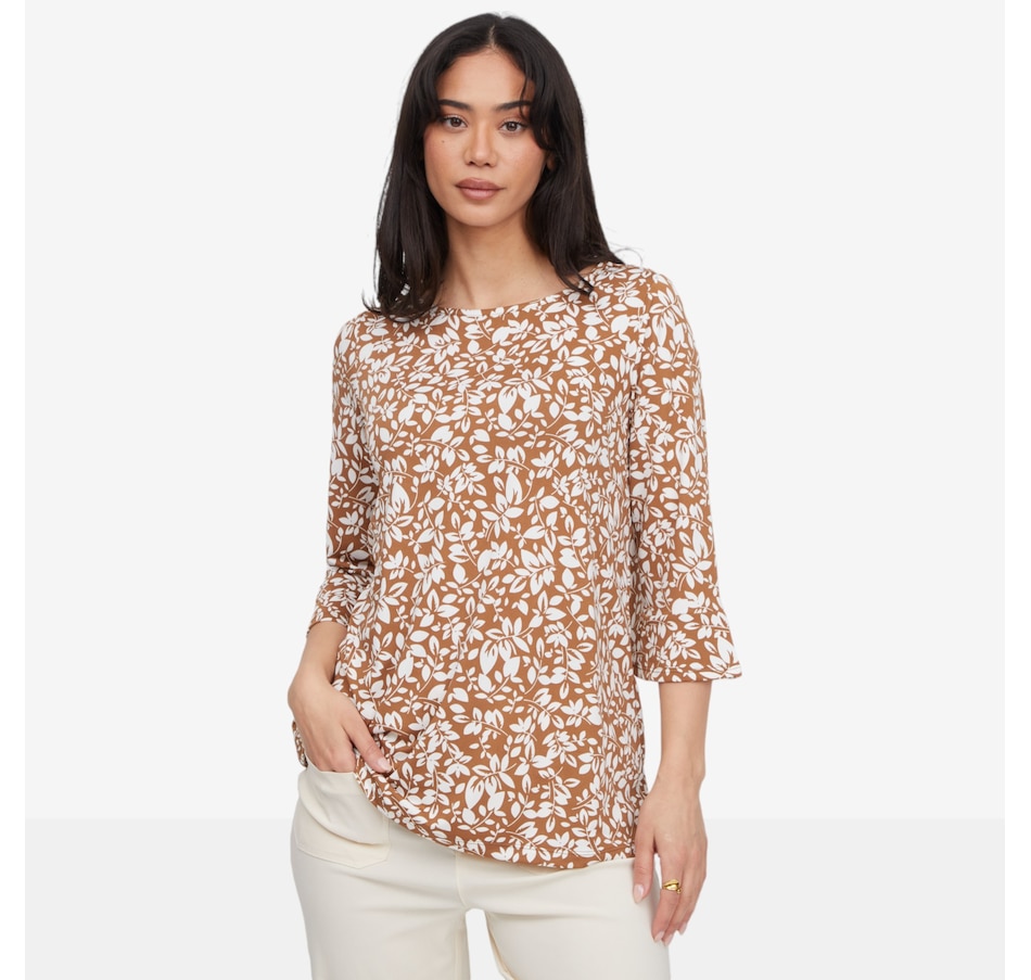 Effortlessly feminine and comfortable, the Kim & Co. printed Brazil Knit 3/4 bell sleeve tunic is designed to make everyday dressing feel elevated and easy. Crafted in a signature Brazil knit, this pull‑on tunic features a flattering wide neckline and a relaxed silhouette that drapes gracefully over the body. The bell sleeves steal the spotlight, finished with a delicate flounce at the hem for soft movement and romantic flair. Thoughtfully designed with set‑in sleeves and a durable double‑needle stitched hem, this tunic offers lasting quality alongside all‑day comfort.