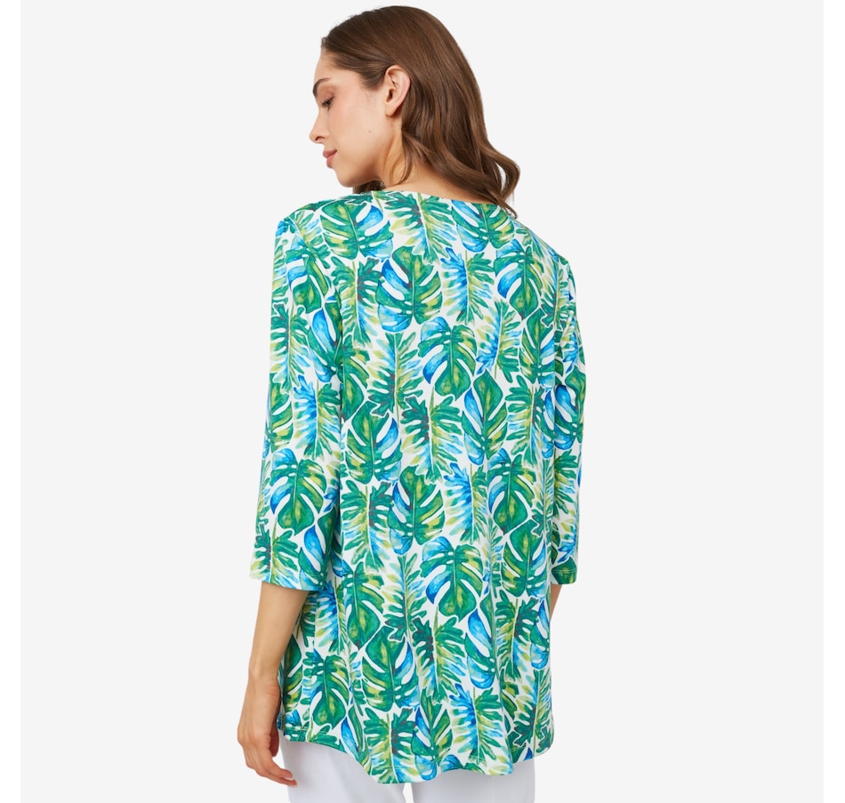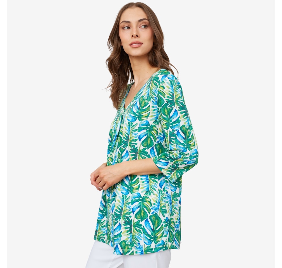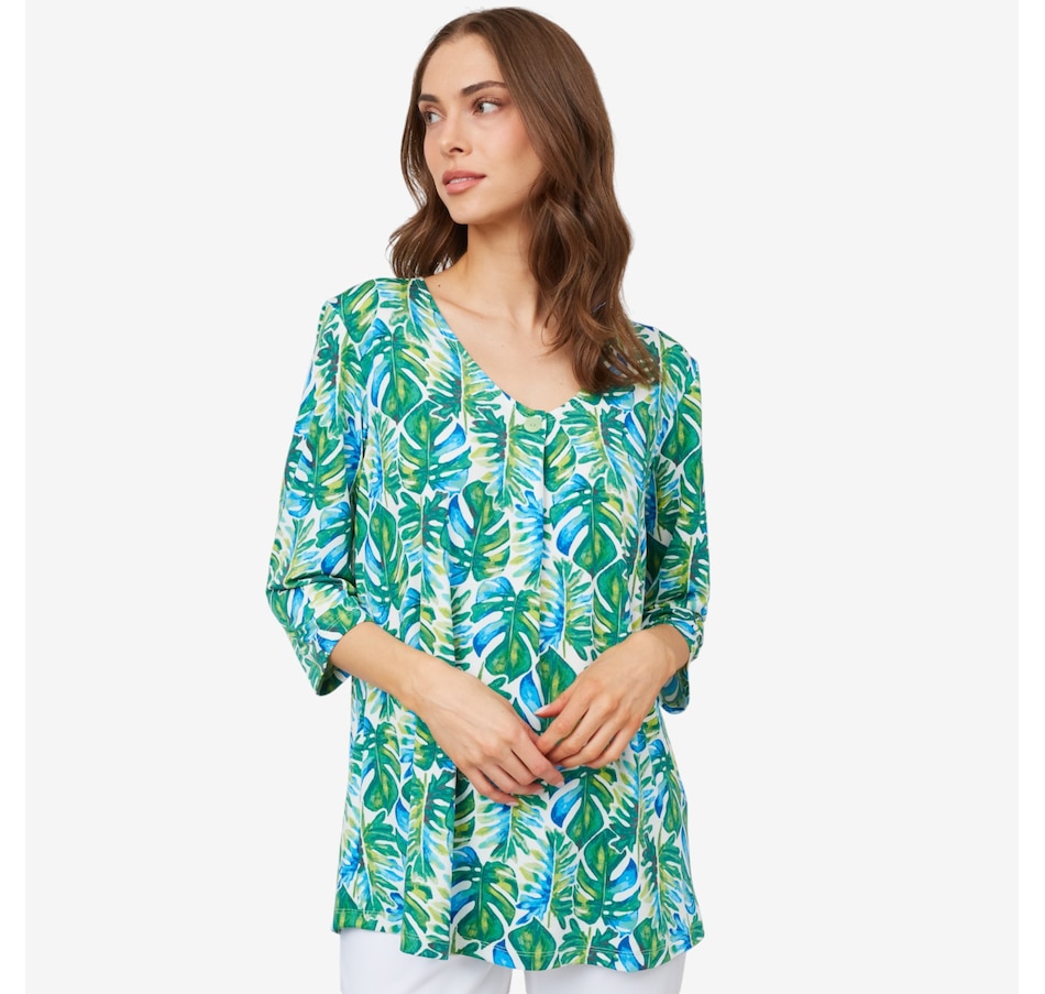 Colourful and vibrant, you'll centre every look in style wearing this 3/4 sleeve pleated front tunic from Kim & Co.