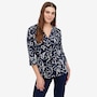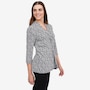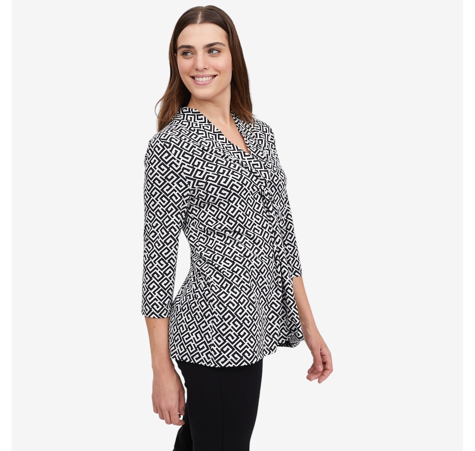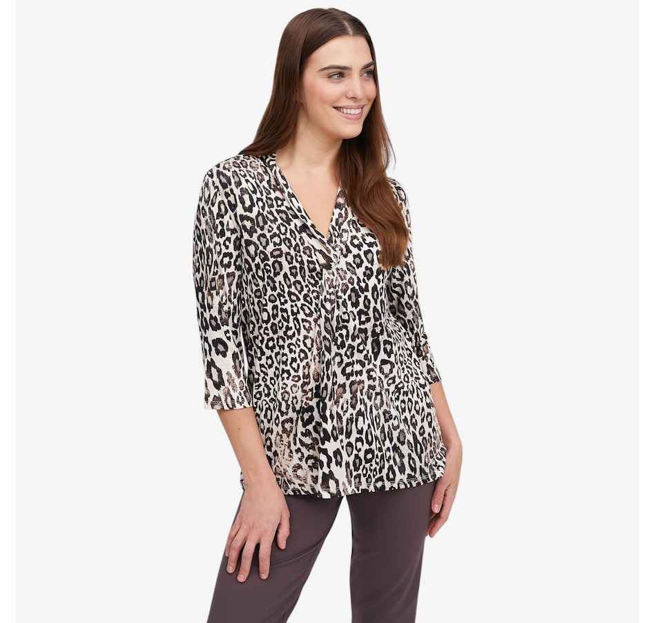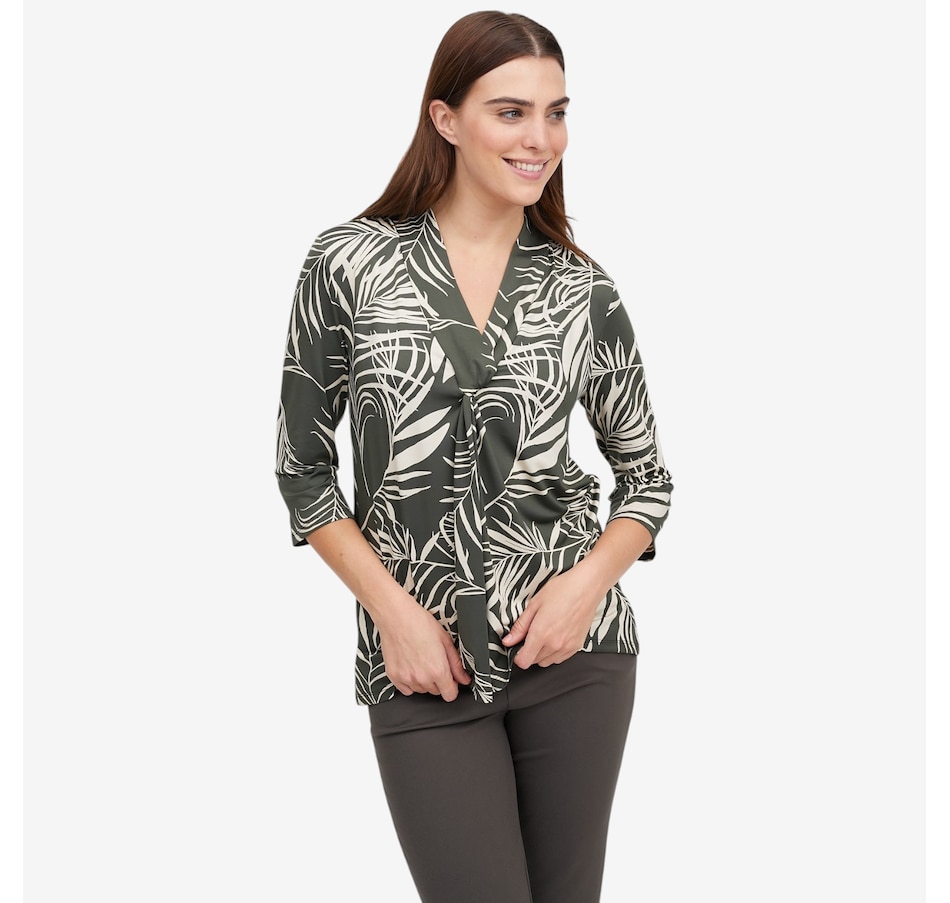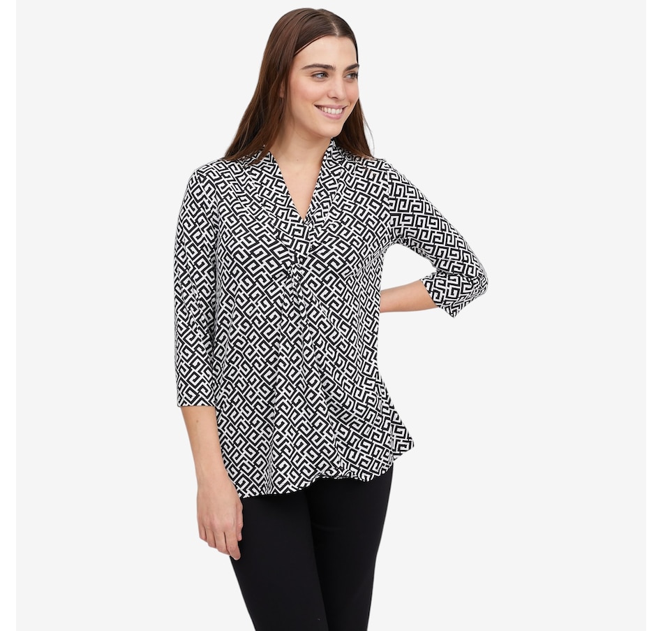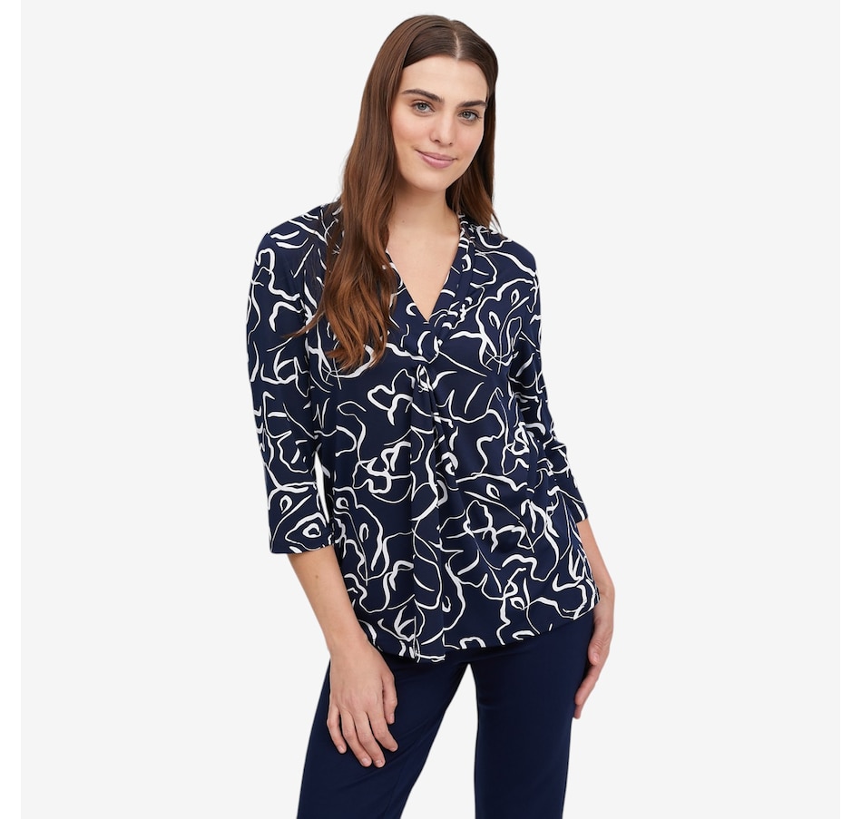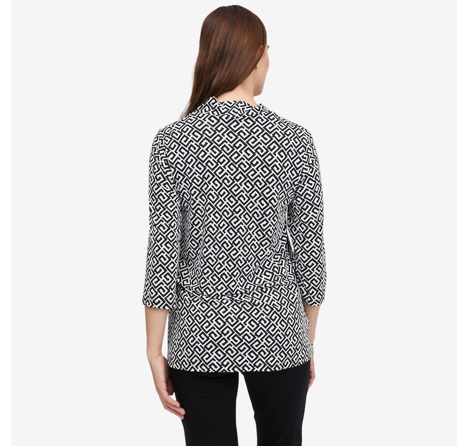 Effortlessly flattering with a touch of modern detail, this printed 3/4 sleeve twist front tunic from Kim & Co. is designed to elevate everyday dressing. Crafted in smooth, comfortable Brazil knit, it features a feminine V‑neckline accented by a wide collar band with a stylish twist detail at the centre front, creating soft shaping and visual interest. The 3/4‑length sleeves offer easy coverage, while the relaxed tunic length pairs wonderfully with slim pants or leggings. Finished with durable double‑needle stitching at the hem, this versatile top delivers comfort, polish, and style.