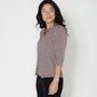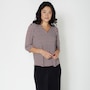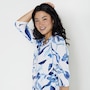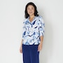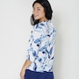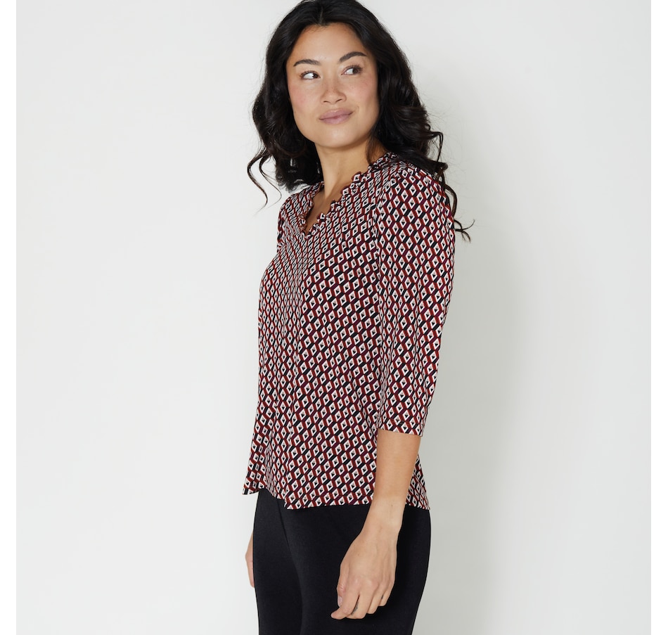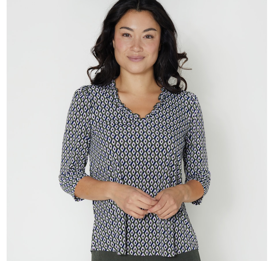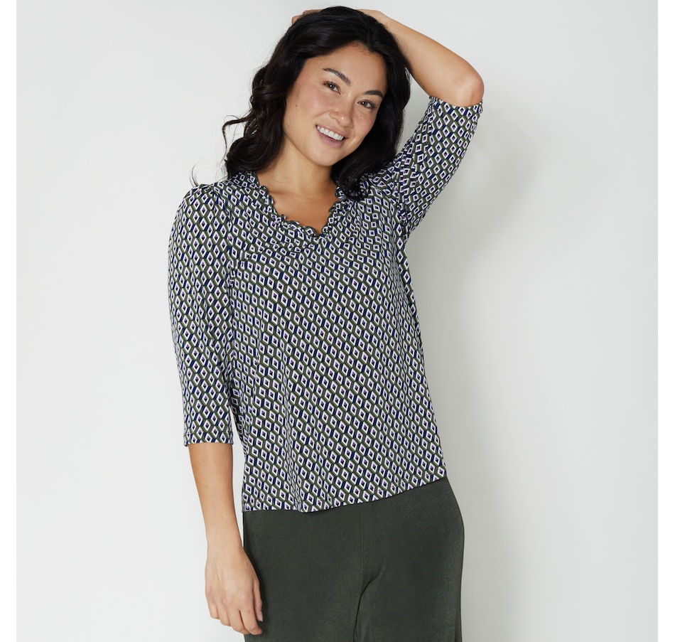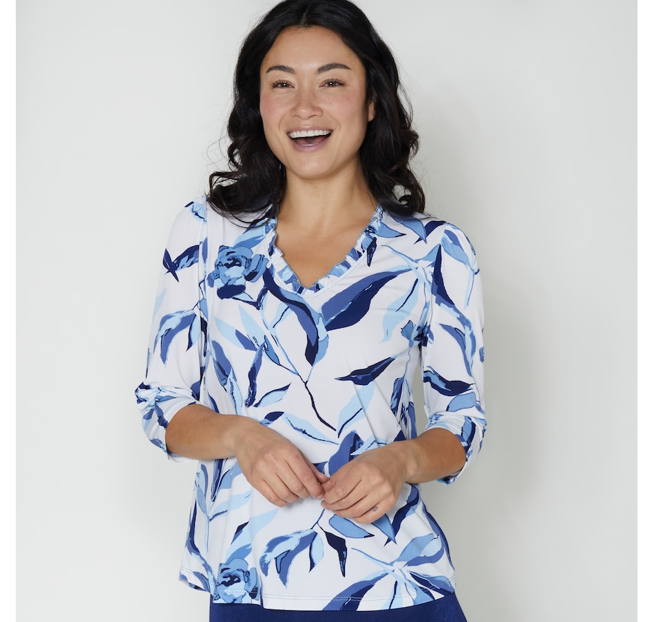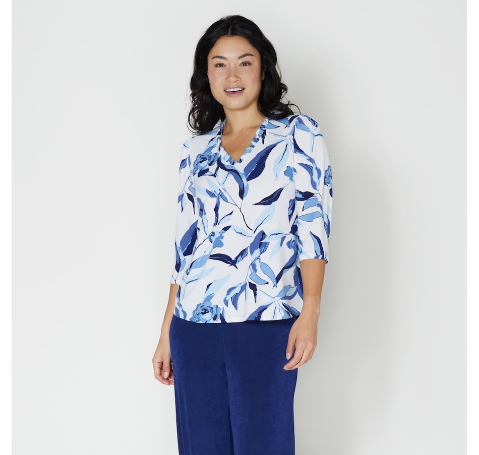 • Soft V-neckline with frill all around, shirring at sleeve head, curved hem