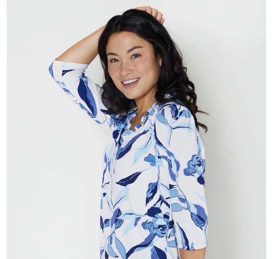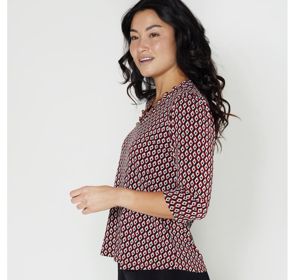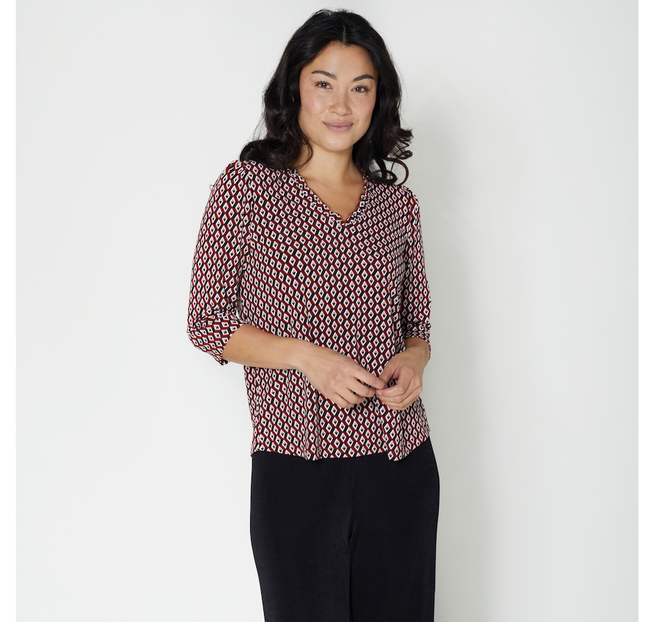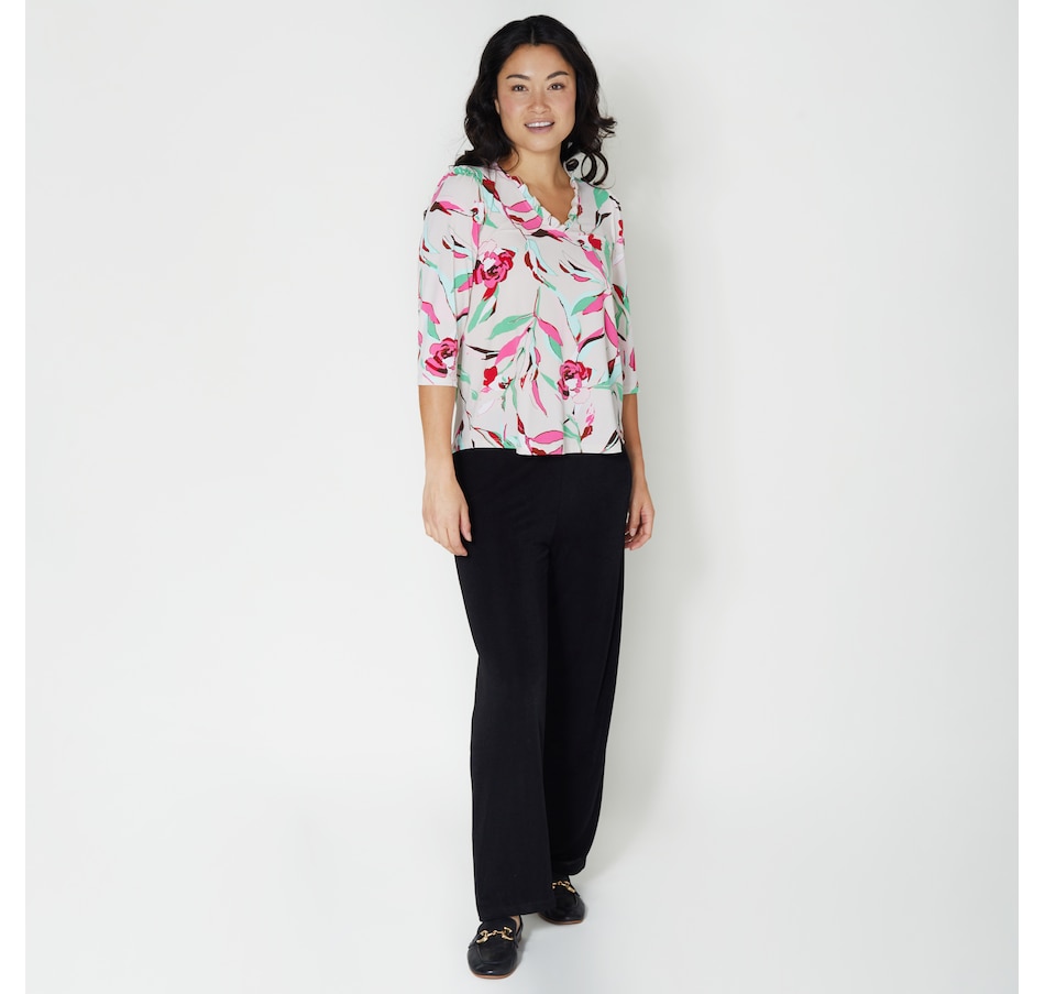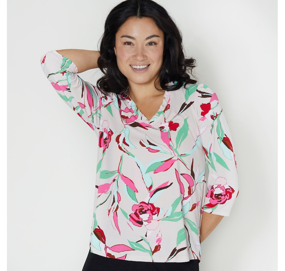 Available in a selection of different multi colours, you'll centre all your ensembles in beautiful style with this printed Brazil knit top from Kim & Co.