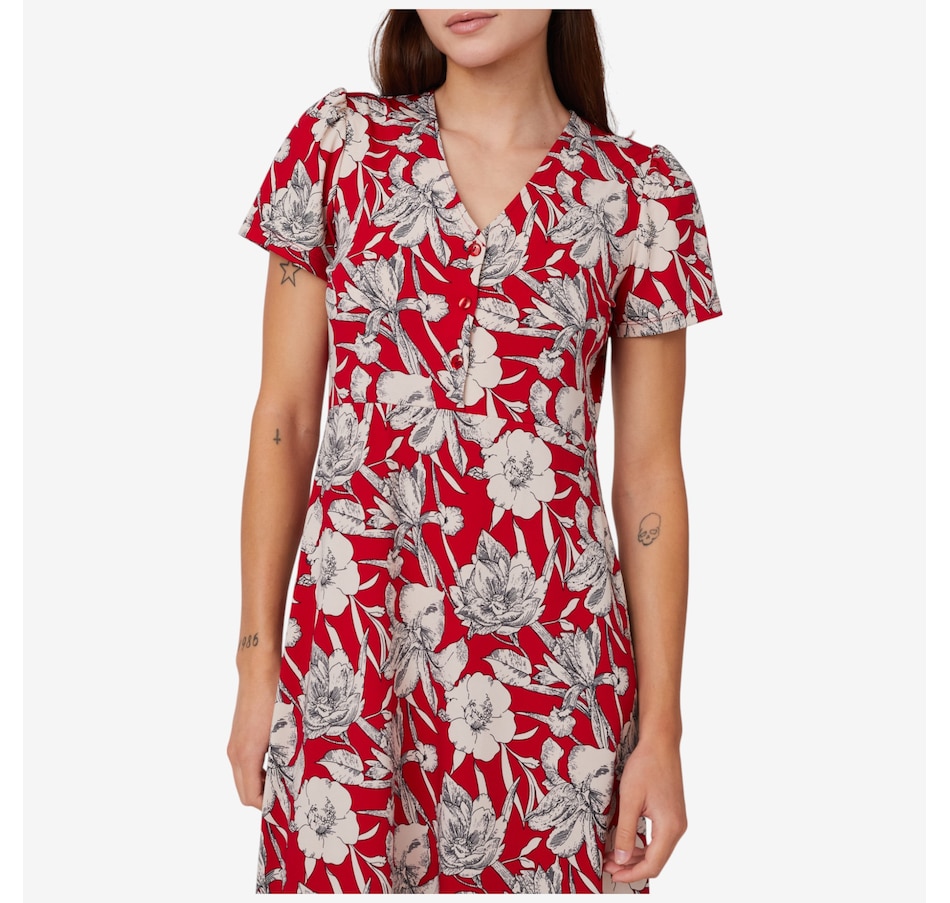 This midi beautiful dress from Kim & Co. features a v-neck, a button closure at the front bust, and a defined waist seam. There is also shirring at sleeve head and a flared skirt.