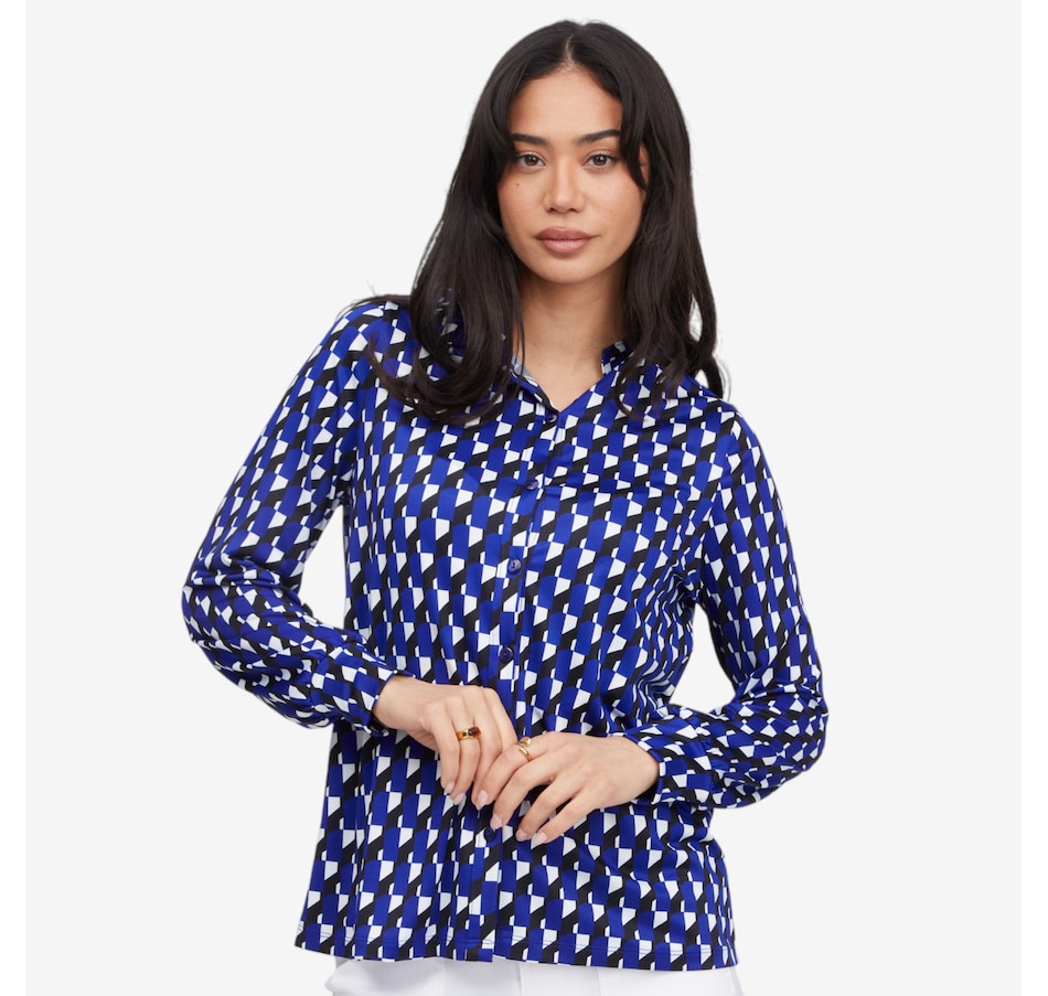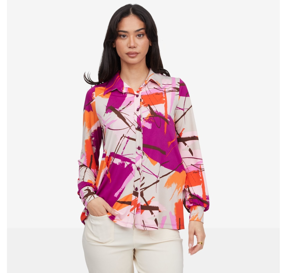 Effortlessly polished and endlessly versatile, the Kim & Co. printed Brazil knit long blouson sleeve shirt is a timeless wardrobe staple you can style up or down with ease. Designed with a classic collar and full front button closure, it delivers a refined look that transitions seamlessly from casual days to more dressed‑up moments. The pretty blouson sleeves, finished with soft shirring and wide cuffs, add a feminine, fashion‑forward touch while maintaining a comfortable, flattering fit.