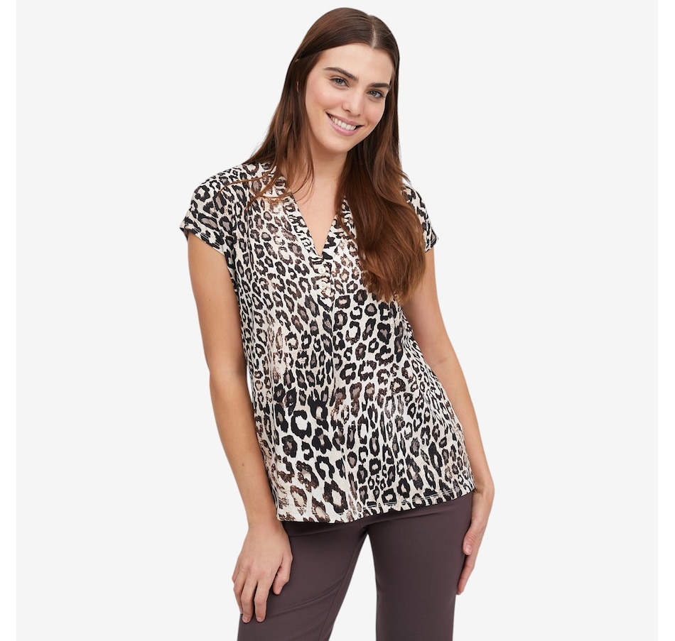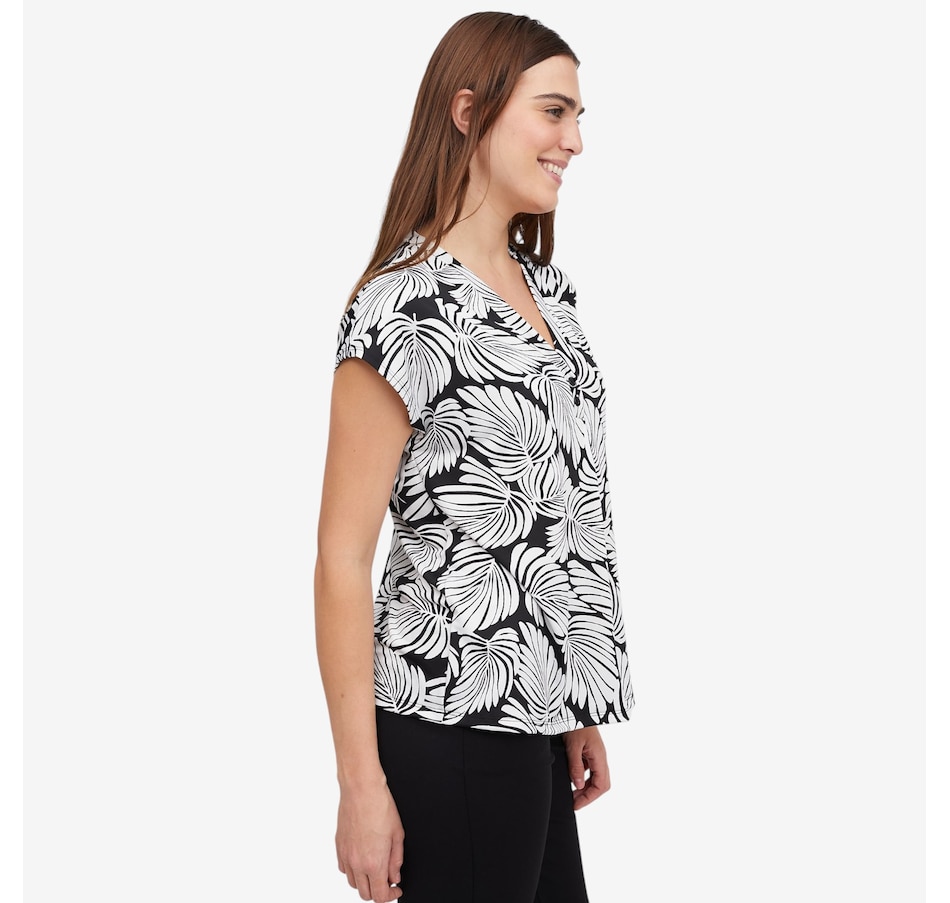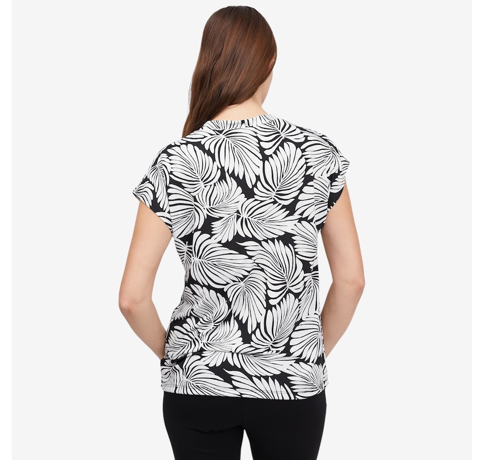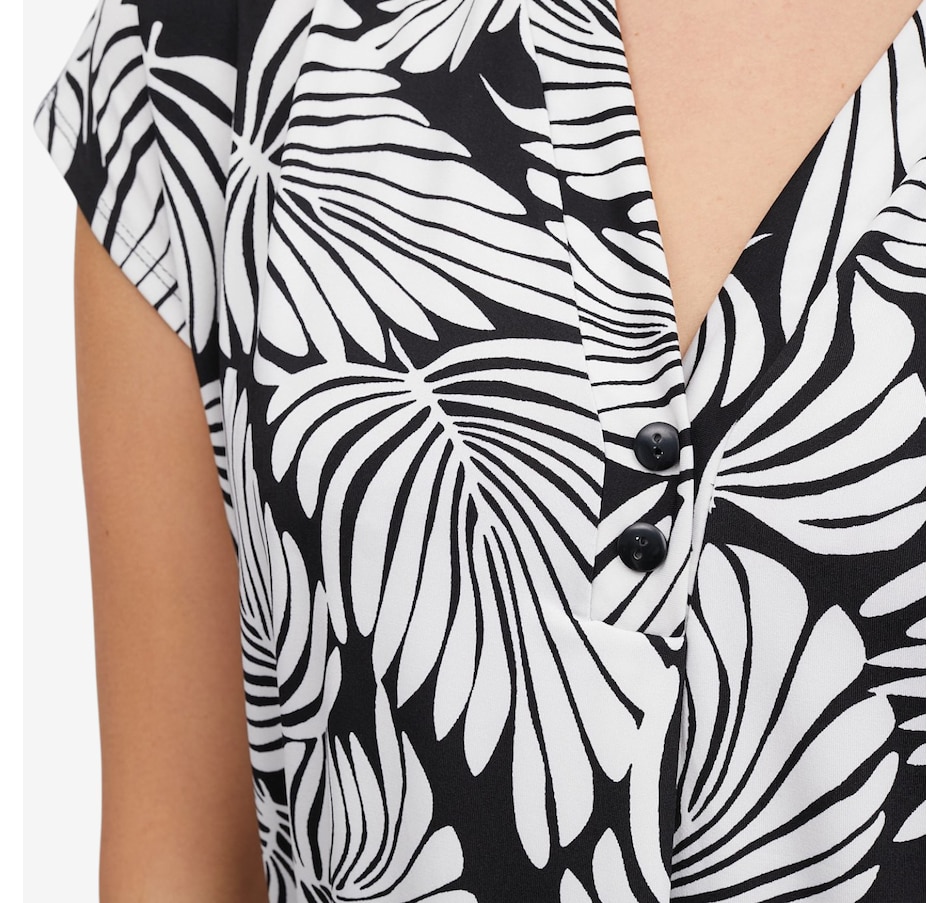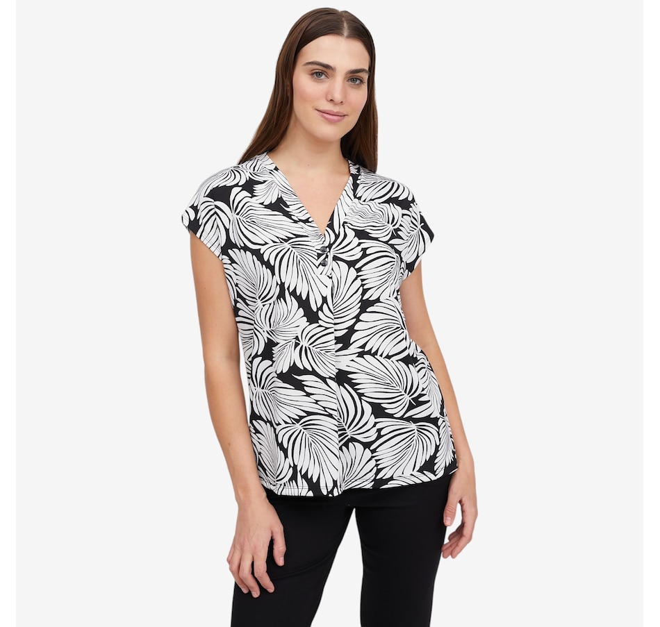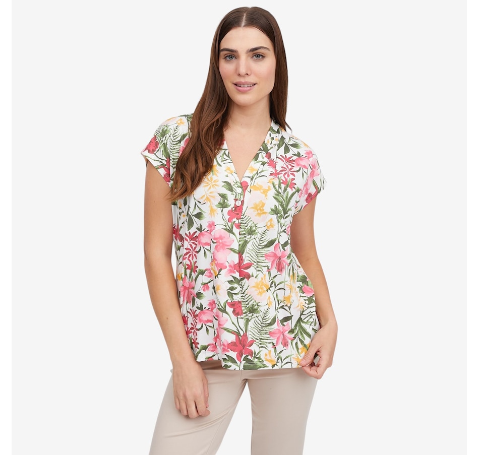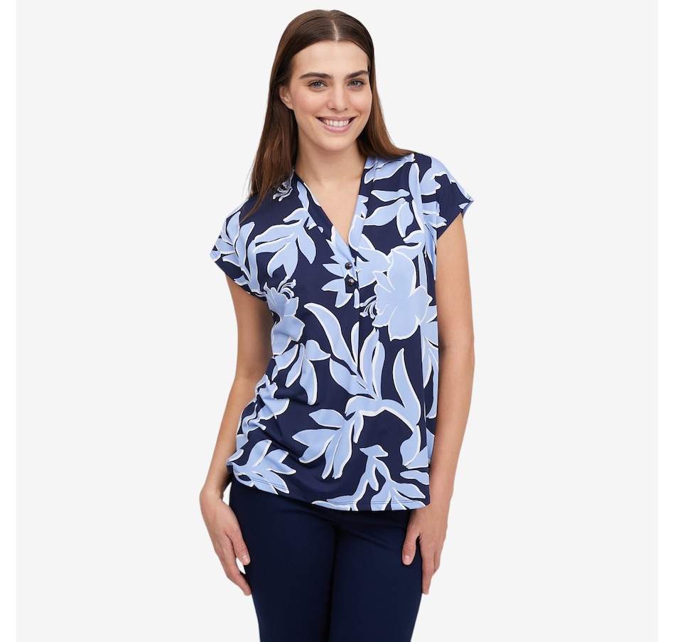 Effortlessly feminine and easy to wear, this printed Brazil knit short dolman sleeve top from Kim & Co. is a fantastic piece to elevate everyday outfits. Designed with a flattering V‑neckline accented by a decorative button‑trim band, it adds just the right amount of detail to a relaxed silhouette. The short dolman sleeves create soft drape and movement, while the smooth fabric offers all‑day comfort with a polished finish.